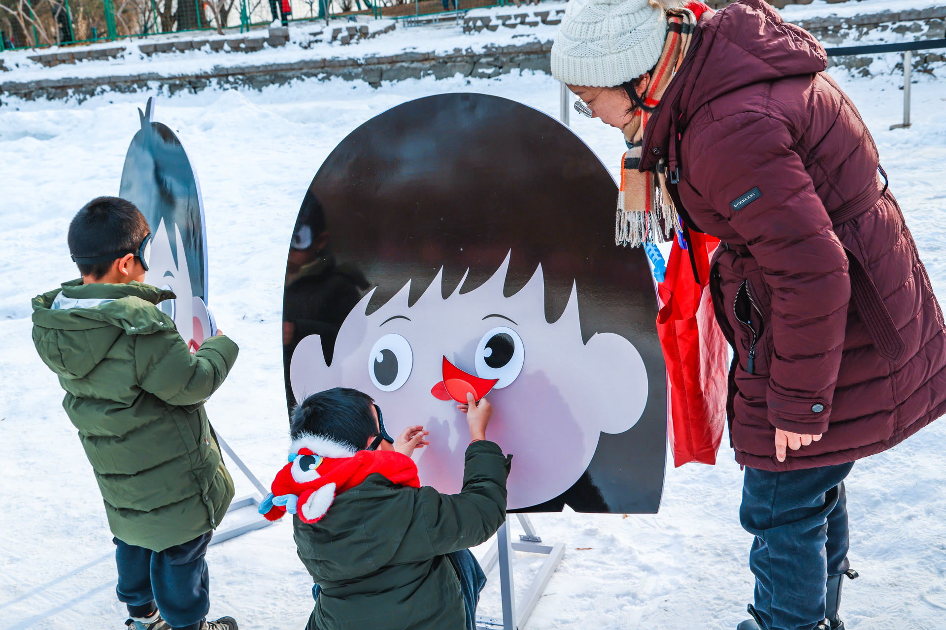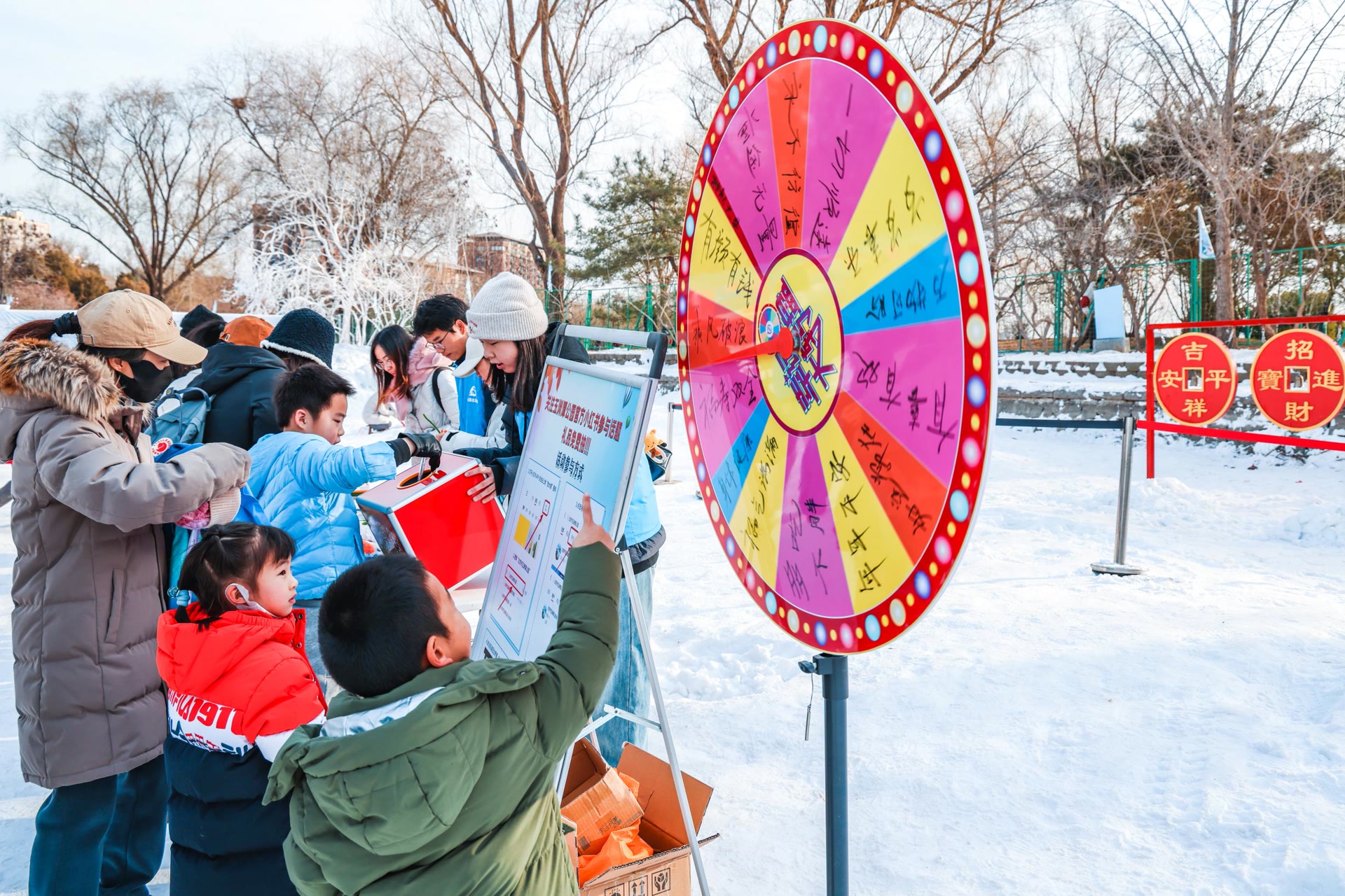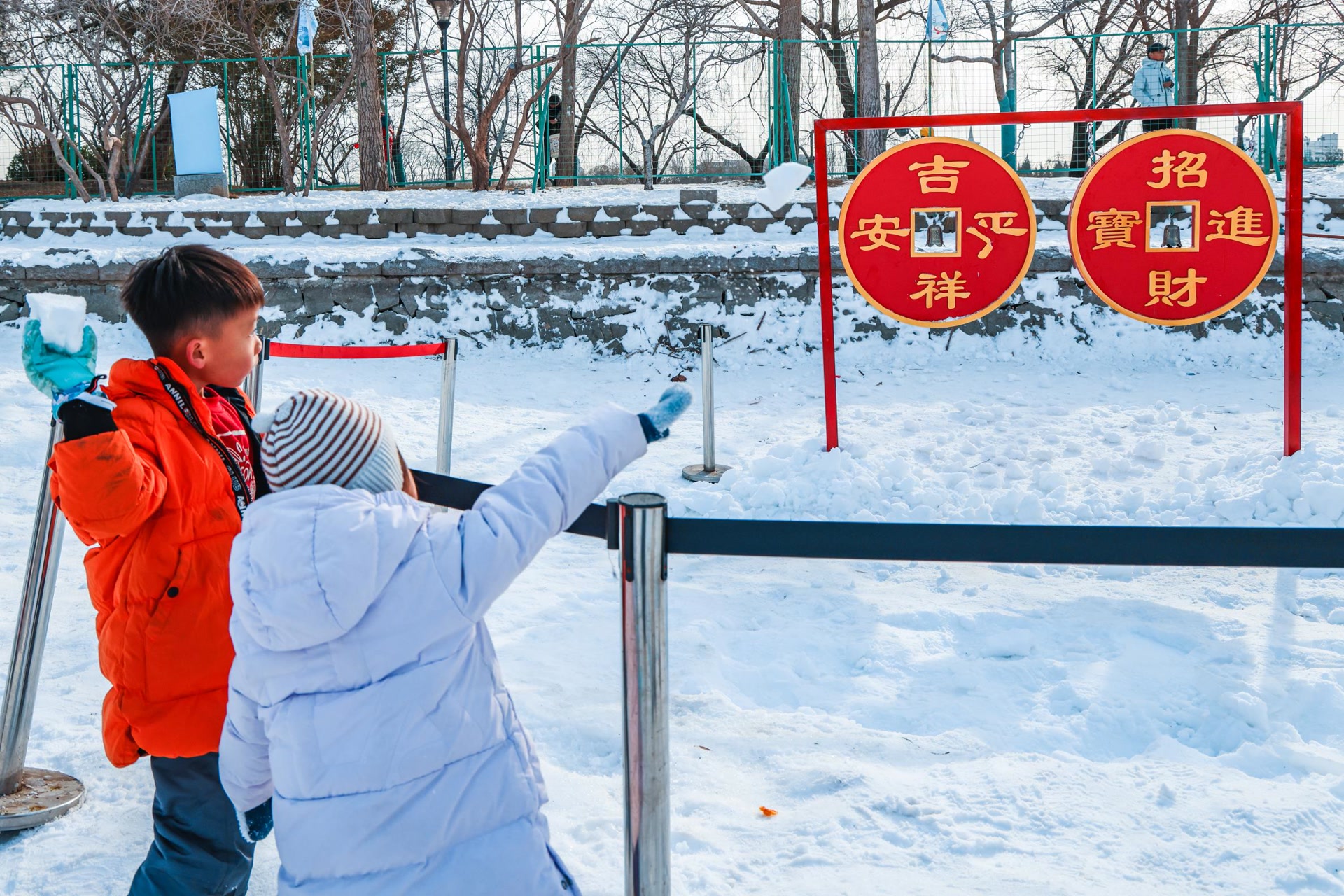 活动现场,公园还特别设置了“新年祈福”环节。游客们通过转动写满祝福语的新年大转盘,祝福自己及亲人2025年万事顺遂。而孩子们则争先恐后地向象征着好运的“铜钱眼儿”里投掷雪球,并与爸爸妈妈比试谁投得更准,现场欢声笑语不断。