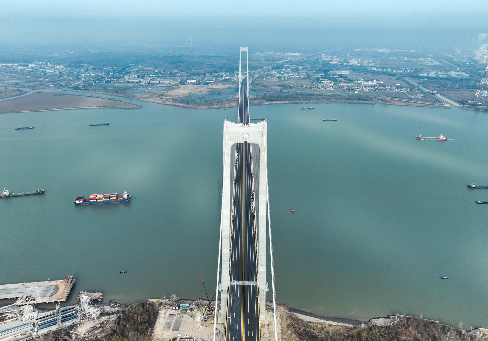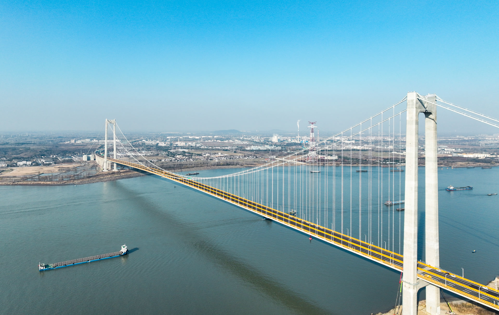 大桥采用主跨1560米的钢箱梁悬索桥一跨过江,其跨度规模在世界范围内都位居前列,主桥由110段钢箱梁组成。大桥包含南北两座主塔,为门式钢筋混凝土塔,其中南主塔高237.5米,相当于80层楼高。中交二航局承建宁扬长江大桥南主塔、南引桥和南接线等工程。