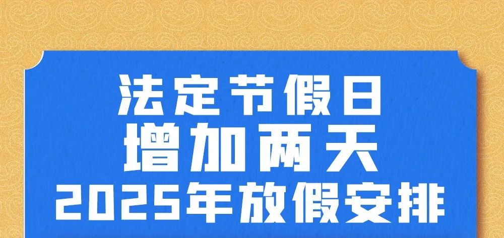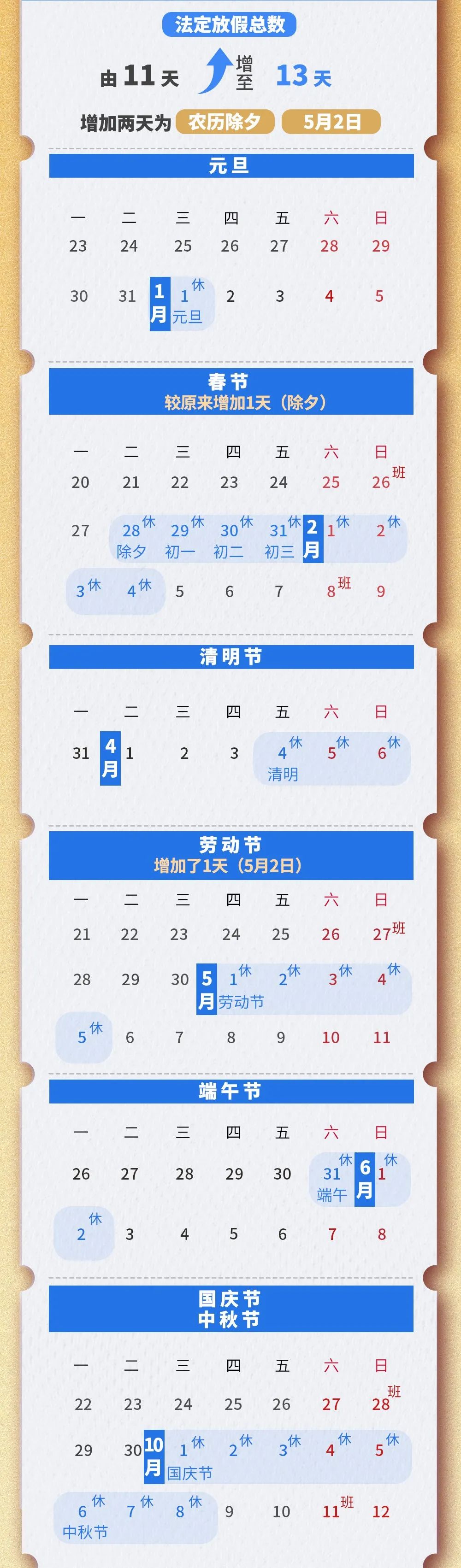 根据2024年11月修订的《全国年节及纪念日放假办法》,自2025年1月1日起,全体公民放假的假日增加2天,即农历除夕、5月2日。增加后,春节放假4天(农历除夕、正月初一至初三),劳动节放假2天(5月1日、2日)。放假总天数从11天增加至13天。