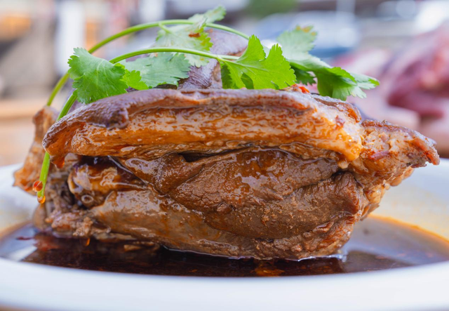 “八大碗”里久负盛名的一道菜肴名为“碗口”。做这道菜需用上好的猪腿,清洗后,加入酱油、冰糖、辣椒等调料,再经过漫长的炖煮,方能成就这软烂入味、醇香浓郁的口感。