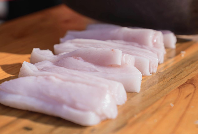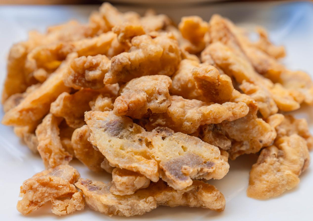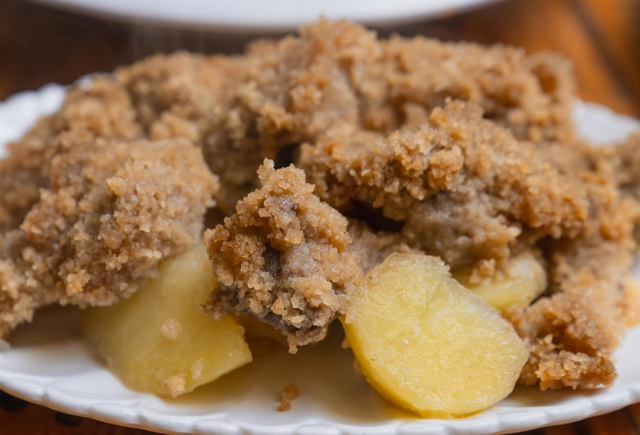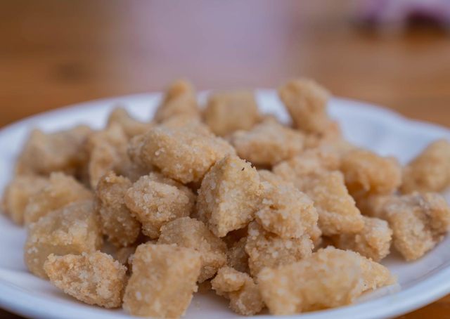 “高丽肉”是最独特的,这道菜用的是猪胸脯上那片最纯净的肥膘,切成丁,裹上薄薄的一层蚕豆淀粉,炸出肥膘里多余的油脂后,再裹上白糖熬成的糖稀。这道菜甜而不腻,带着“糯泱泱”的口感,趁热吃,非常上瘾……