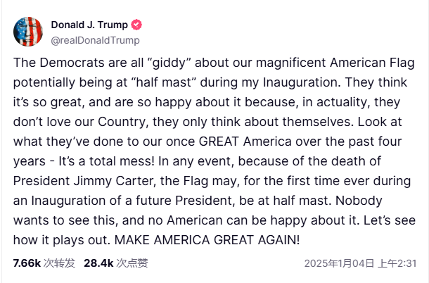 特朗普3日在社交媒体上发文,对1月20日总统就职典礼当天美国国旗仍继续因前总统吉米·卡特逝世而处于降半旗状态表示不满。
