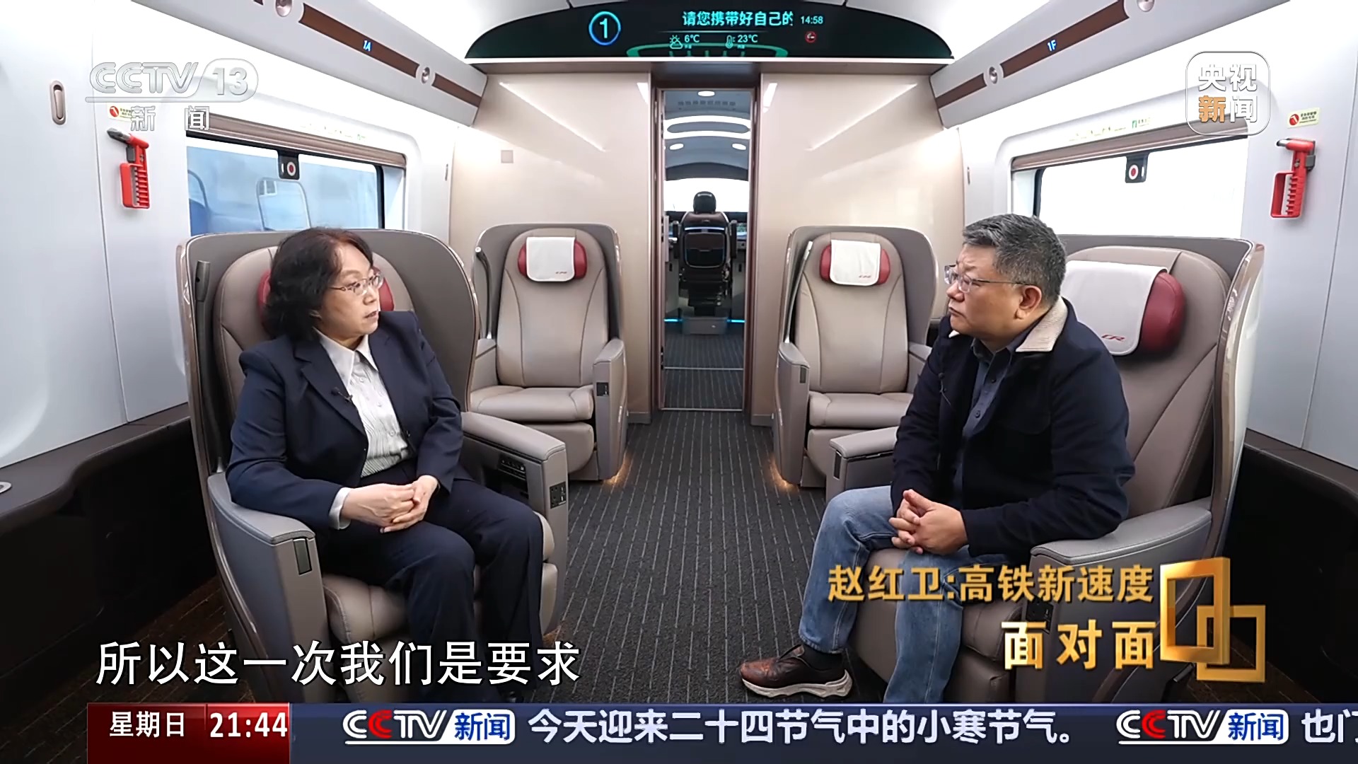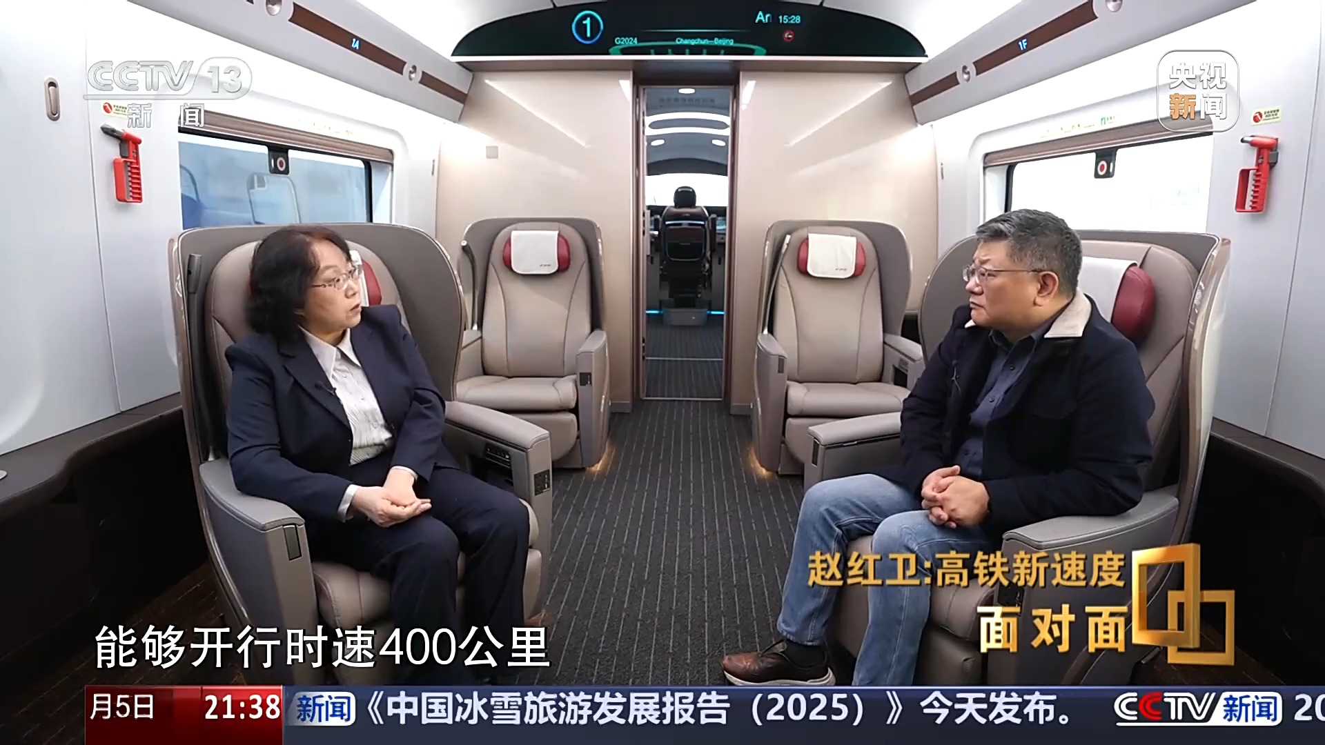 记者:所以今天也是面对面采访以来坐得最舒适的椅子之一,因为今天在车厢里采访,所以我们就借用了这样的一个商务舱采访。明显的感觉进到这个CR450的车内,感觉比以往高铁的舒适性和智能性可能更强化了一点。