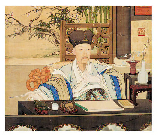 △清 乾隆帝写字像。乾隆帝的书案上有砚台、水丞等文房用具。