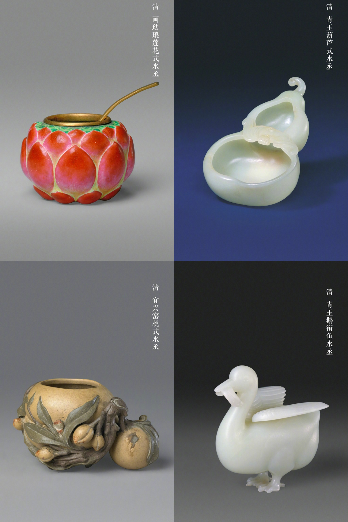 水丞、砚滴、砚屏都是属于与砚台有关的文房清供。文房清供是围绕文房四宝出现的辅助用具,它们不仅具有实用价值,同时也是书案上清雅的陈设品。