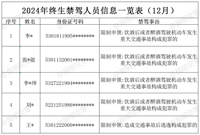 2024年12月,全市有5人因酒醉驾发生重大交通事故或造成交通事故后逃逸构成犯罪,被依法吊销机动车驾驶证且终生不得重新申领。现将名单予以曝光: