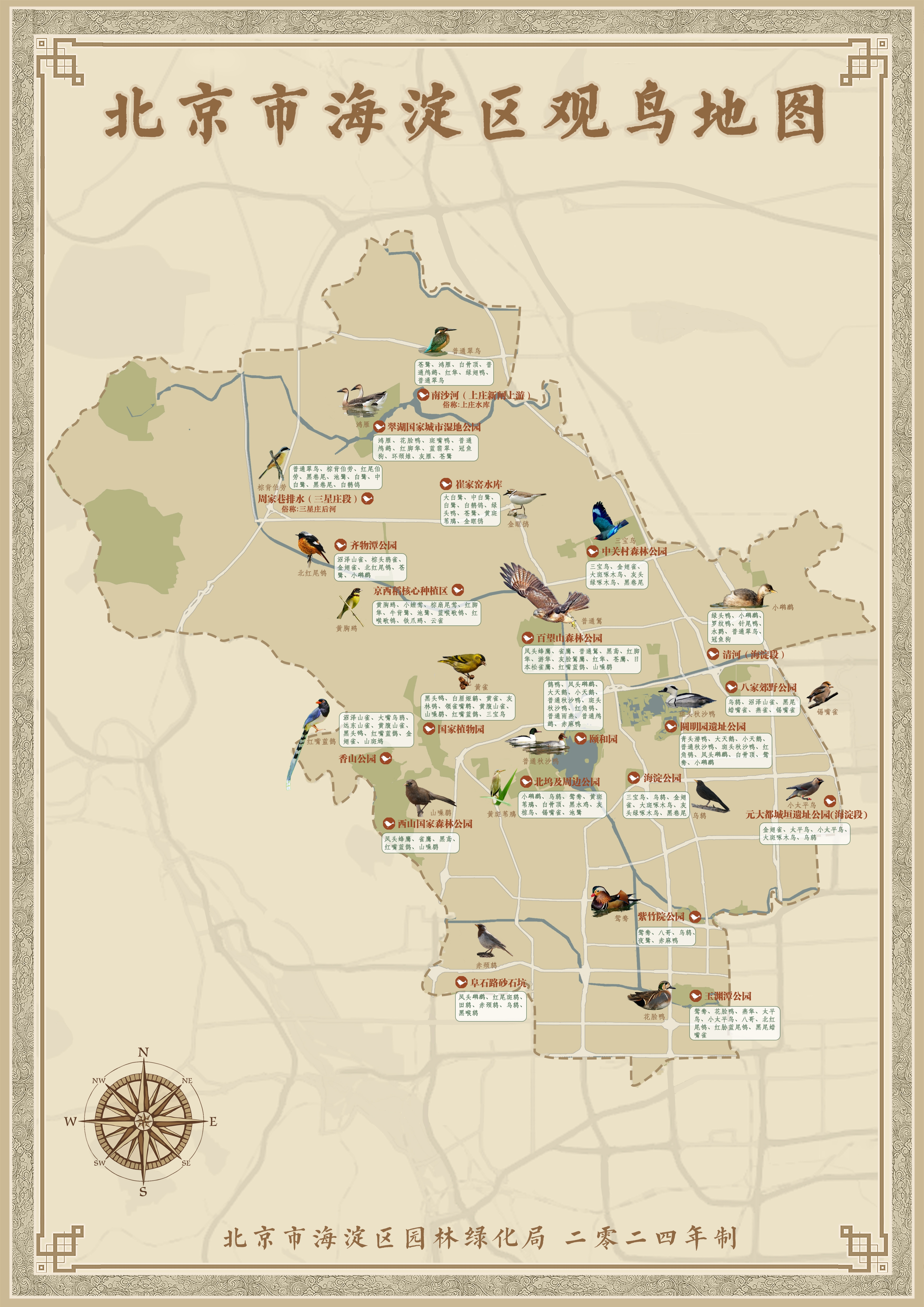 鵟虽然已经离开,但海淀区三山五园地区的鸟儿可不少。日前海淀区园林绿化局发布了《海淀区观鸟地图》,海淀观鸟胜地众多,颐和园、圆明园遗址公园、翠湖国家城市湿地公园以及香山公园等20余处鸟类资源丰富的观鸟点位,各有代表性的、较为珍贵的鸟类,其中不乏热门的“明星”鸟类。