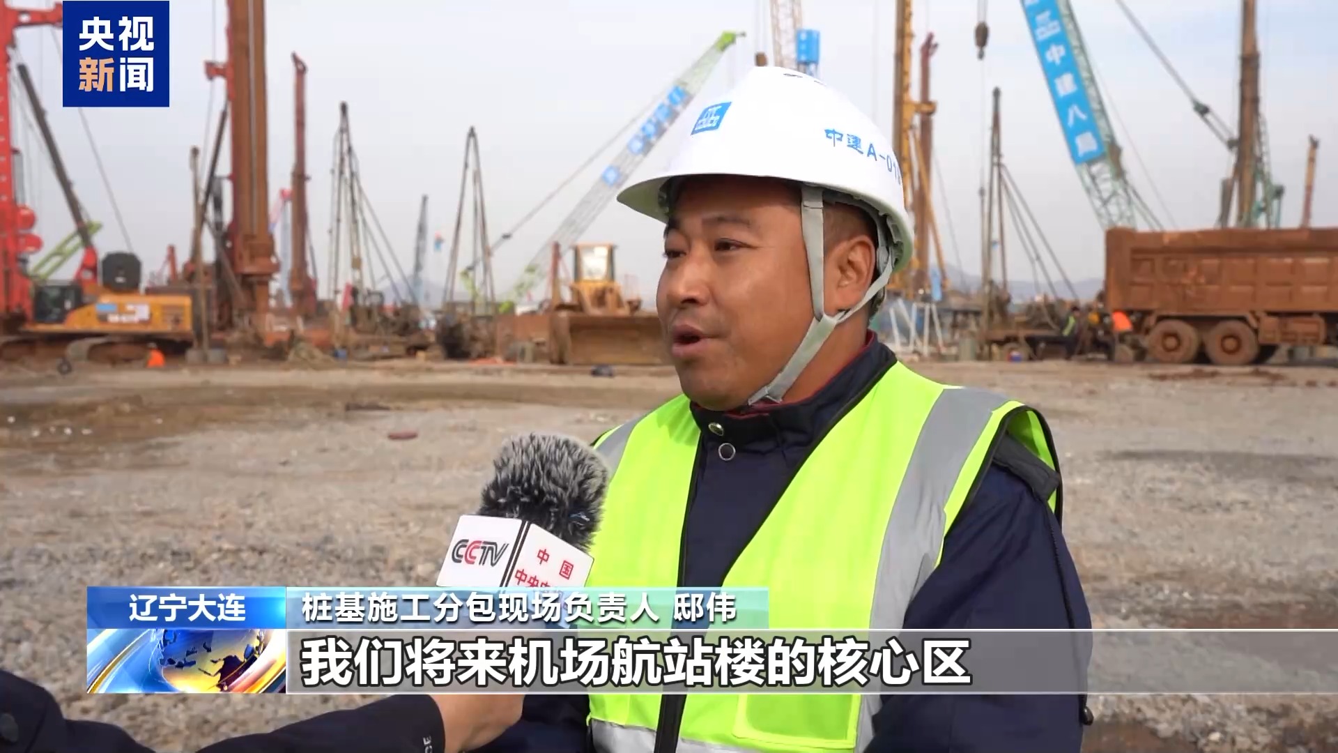 桩基施工分包现场负责人 邸伟:所在的位置就是将来机场航站楼的核心区,目前正在进行桩基础施工,桩基础总共3000多根灌注桩。