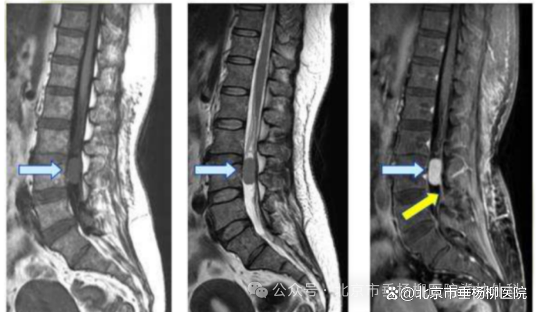 脊膜瘤在MRI上特征性的图像为在增强MRI上出现的“硬膜尾征”,肿瘤局部的硬脊膜增厚,呈现线样强化并与肿瘤紧密相连。图中黄色箭头像尾巴一样的亮线条就是“硬膜尾征”。
