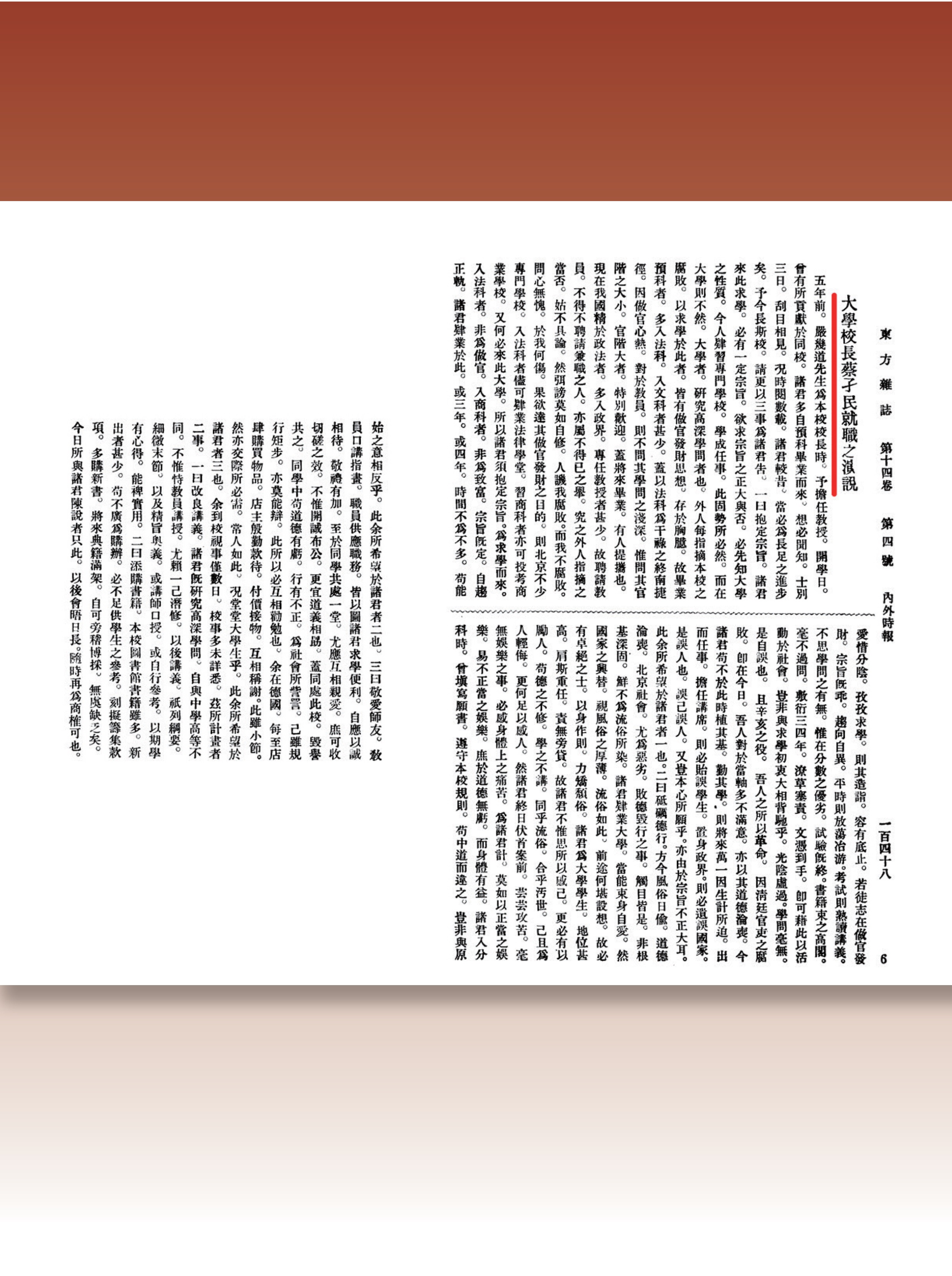 1917年1月9日,蔡元培发表就任北京大学校长演说,指出“大学者,研究高深学问者也”。大学生肩负振兴国家重任,因此,应该做到“抱定宗旨”“砥砺德行”“敬爱师友”。图为《东方杂志》第14卷第4号上刊载的《大学校长蔡孑民就职之演说》全文。