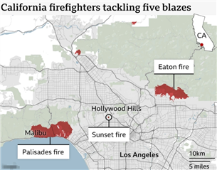伊顿山火(Eaton fire):位于洛杉矶北部,席卷了阿尔塔迪纳等城市。是洛杉矶当前第二大火灾,过火面积约10600英亩(42.8平方公里),同样未能得到有效控制。
