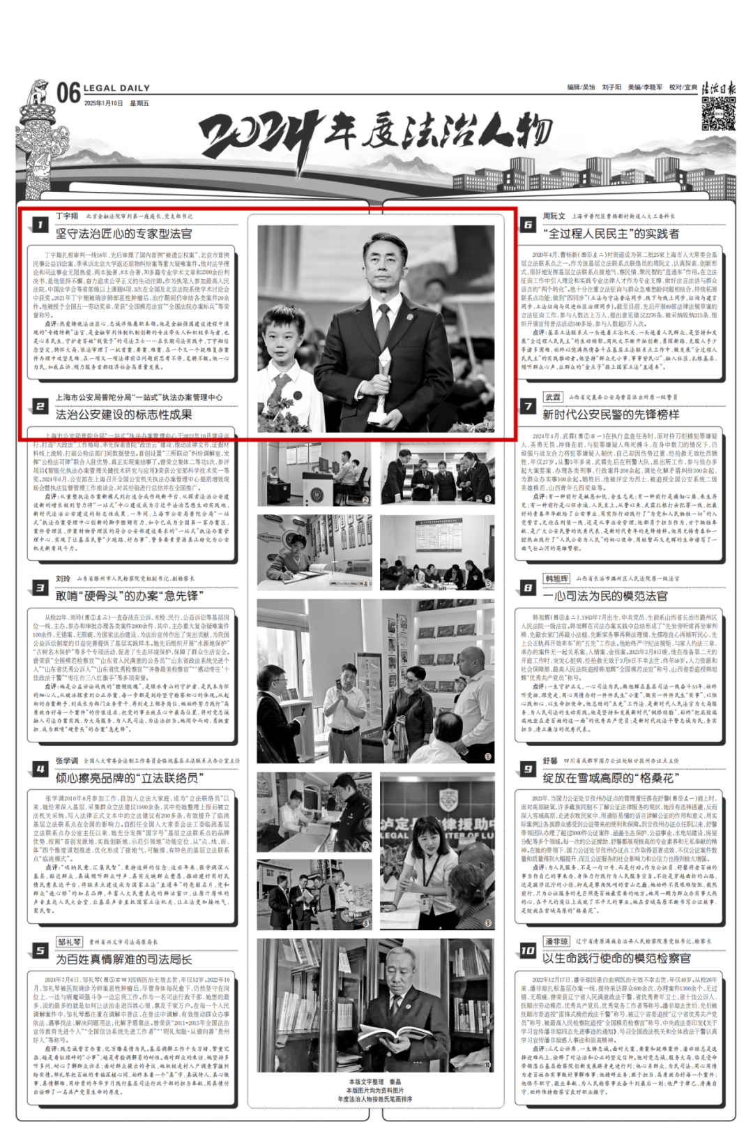 由法制日报社主办,以“梳理年度法治新闻,推动中国法治进程”为宗旨的2024年十大法治新闻、年度法治人物、十大国际法治新闻评选结果今天揭晓。经初评委员会推荐、终评委员会定评等程序,“习近平亲切会见全国公安工作会议代表 激励广大公安民辅警挺膺担当接续奋斗”等入选十大法治新闻,北京金融法院审判第二庭庭长、党支部书记丁宇翔等10人(集体)当选年度法治人物。本次评选设年度法治人物提名奖,浙江省杭州市钱塘区人民检察院党组书记、检察长吕静等5人获得年度法治人物提名奖。“联合国未来峰会通过《未来契约》 中国以实际行动践行多边主义”等入选十大国际法治新闻。