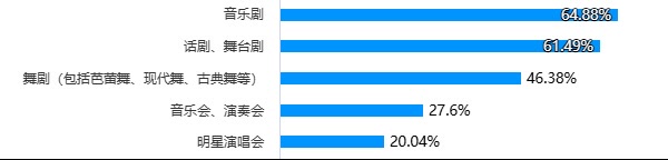 音乐会方面,上海彩虹室内乐团《久石让动漫主题音乐会》以26.37%的比例成为最受欢迎的音乐会,其次是久石让&宫崎骏经典动漫作品视听音乐会《天空之城》和“泱泱国风”中央民族乐团大型民族管弦乐音乐会。