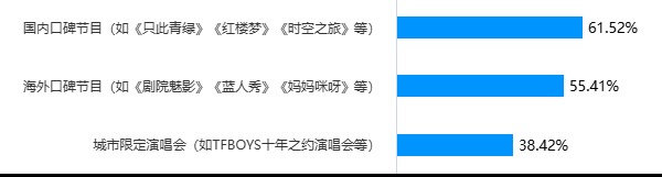 近年来,跨城观演成为流行现象,不止大型演唱会,剧场演出也吸引了不少跨城而来的观众。报告显示,61.52%的观众愿意为国内口碑节目跨城观演,55.41%的观众愿意为海外口碑节目跨城观演,显示出节目口碑对观众决策的重要影响。