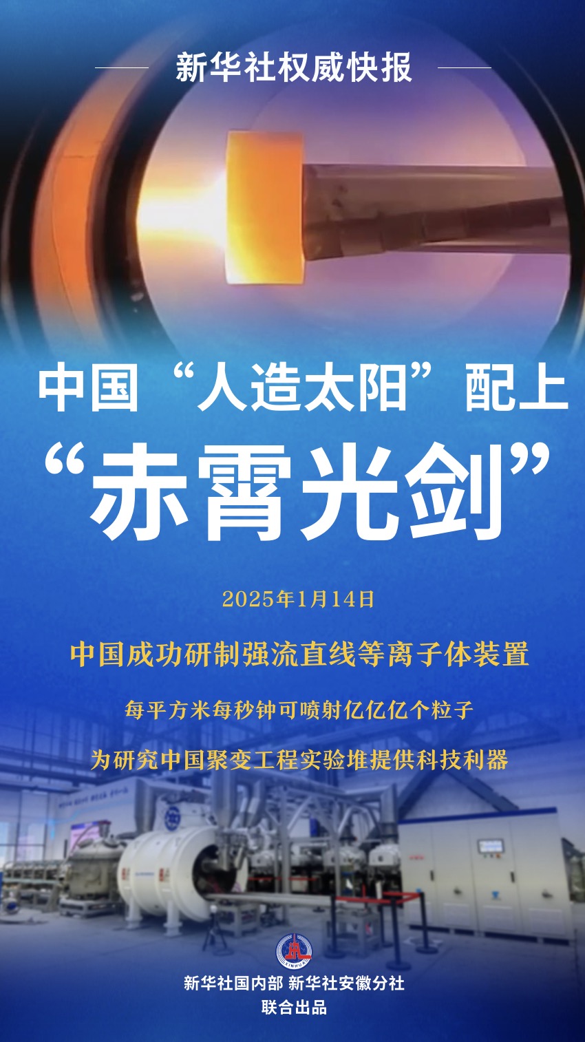每平方米每秒钟可极速喷射亿亿亿个粒子!记者从中国科学院合肥物质科学研究院获悉,该院大科学团队成功研制强流直线等离子体装置“赤霄”,如同一把性能超强的“激光剑”,为研制“人造太阳”核心材料提供科技利器。