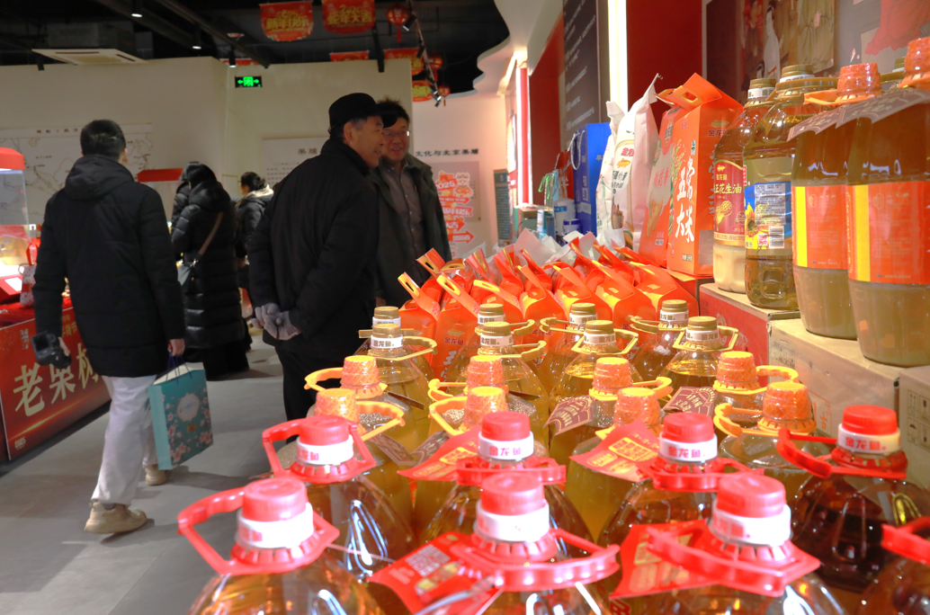 走进年货节展厅,可见各处悬挂着红色的灯笼,张贴着喜庆的福字,营造出浓郁的过年氛围。展位上干果、糖果、饼干等各式各味的休闲食品琳琅满目,酒水饮料、牛奶、糕点等年货礼盒包装精美。