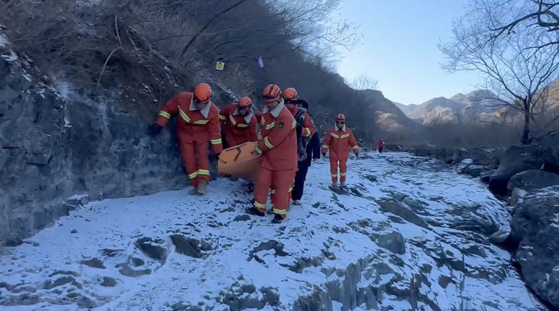 1月14日上午9时19分,门头沟区消防救援支队斋堂消防救援站接到报警称,在斋堂镇鳌鱼沟内,有一名男子因天气寒冷,体力不支,无法行走,急需救援。接到报警后,斋堂消防救援站迅速出动队员,赶赴现场营救。
