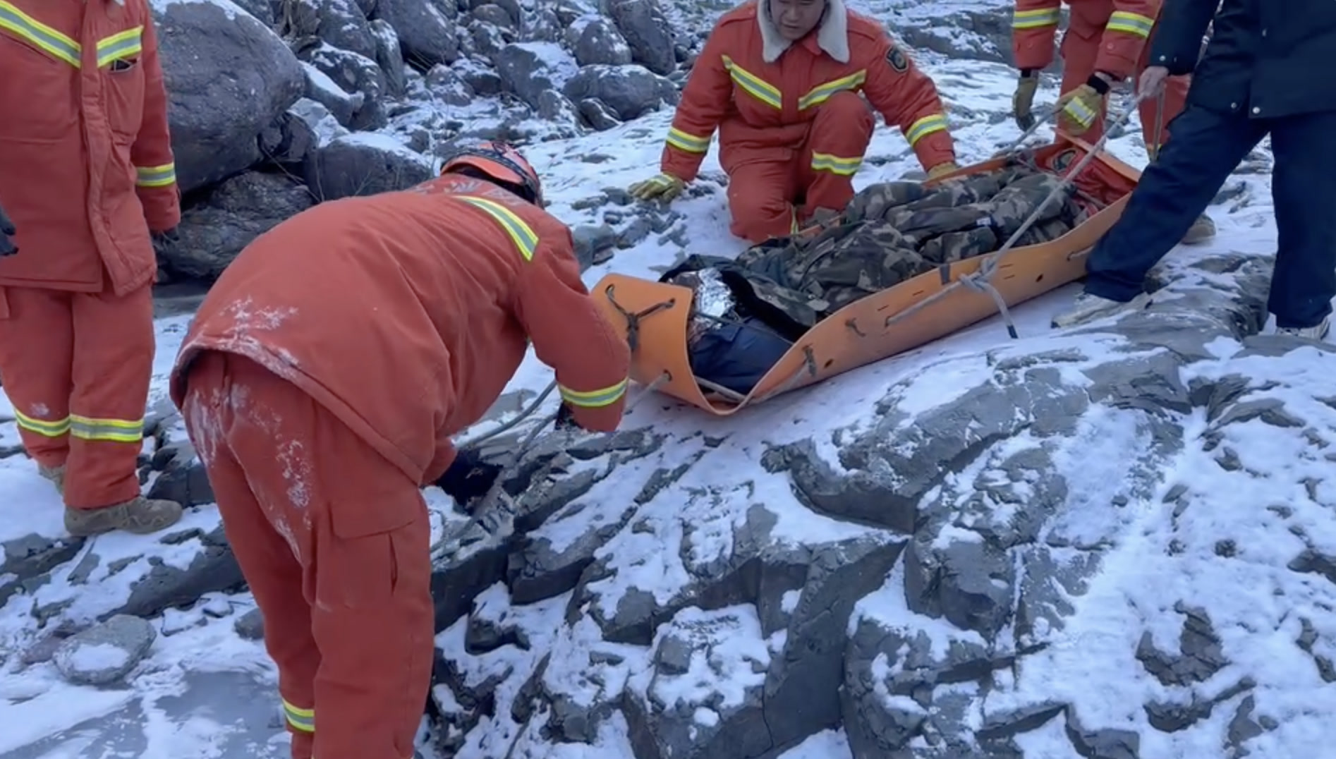 10时10分,救援人员成功找到被困男子,在大家的救助下,男子的身体状况有所好转,随后,消防人员将随身携带的保暖衣物、食品、暖身贴、矿泉水给被困者使用。10时28分,被困男子恢复了些许体力,身体感到暖意后,消防人员使用担架将其转移下山。