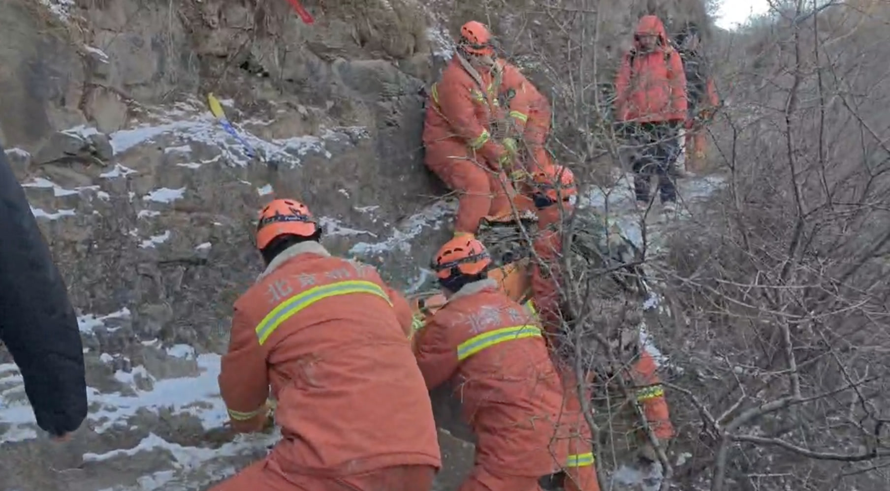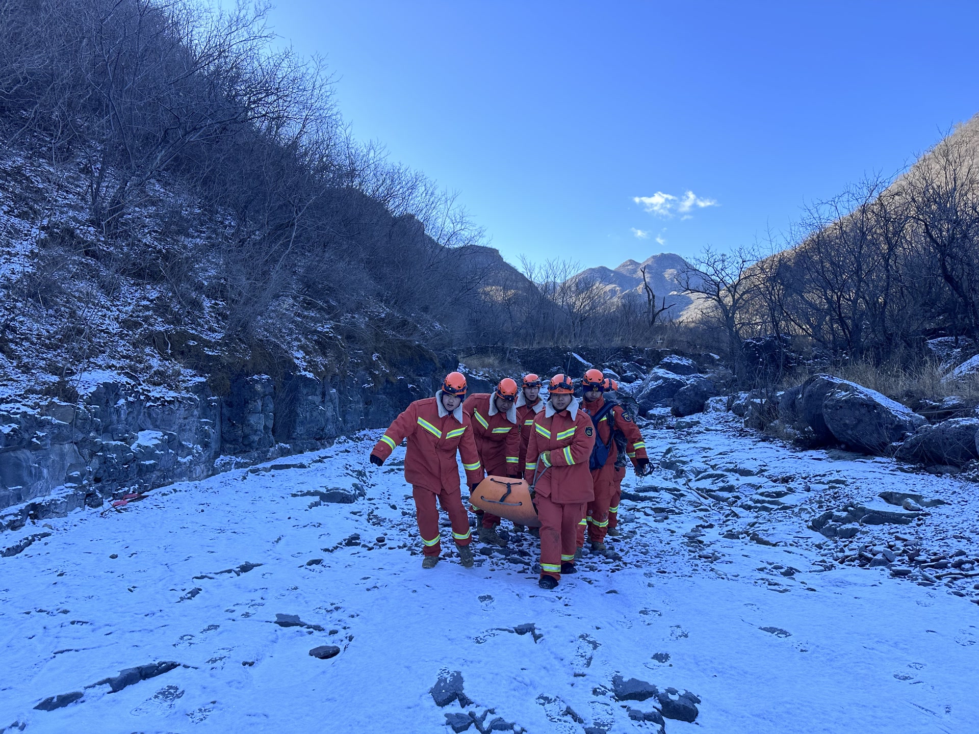 上午9时49分,接警后的斋堂消防救援站的队员到达山下,并与斋堂镇政府工作人员、斋堂派出所民警、医护人员和两名报警人会合。很快,7名消防人员携带担架、应急食品和保暖衣物,并联合两名医护人员,由报警人带领进山。