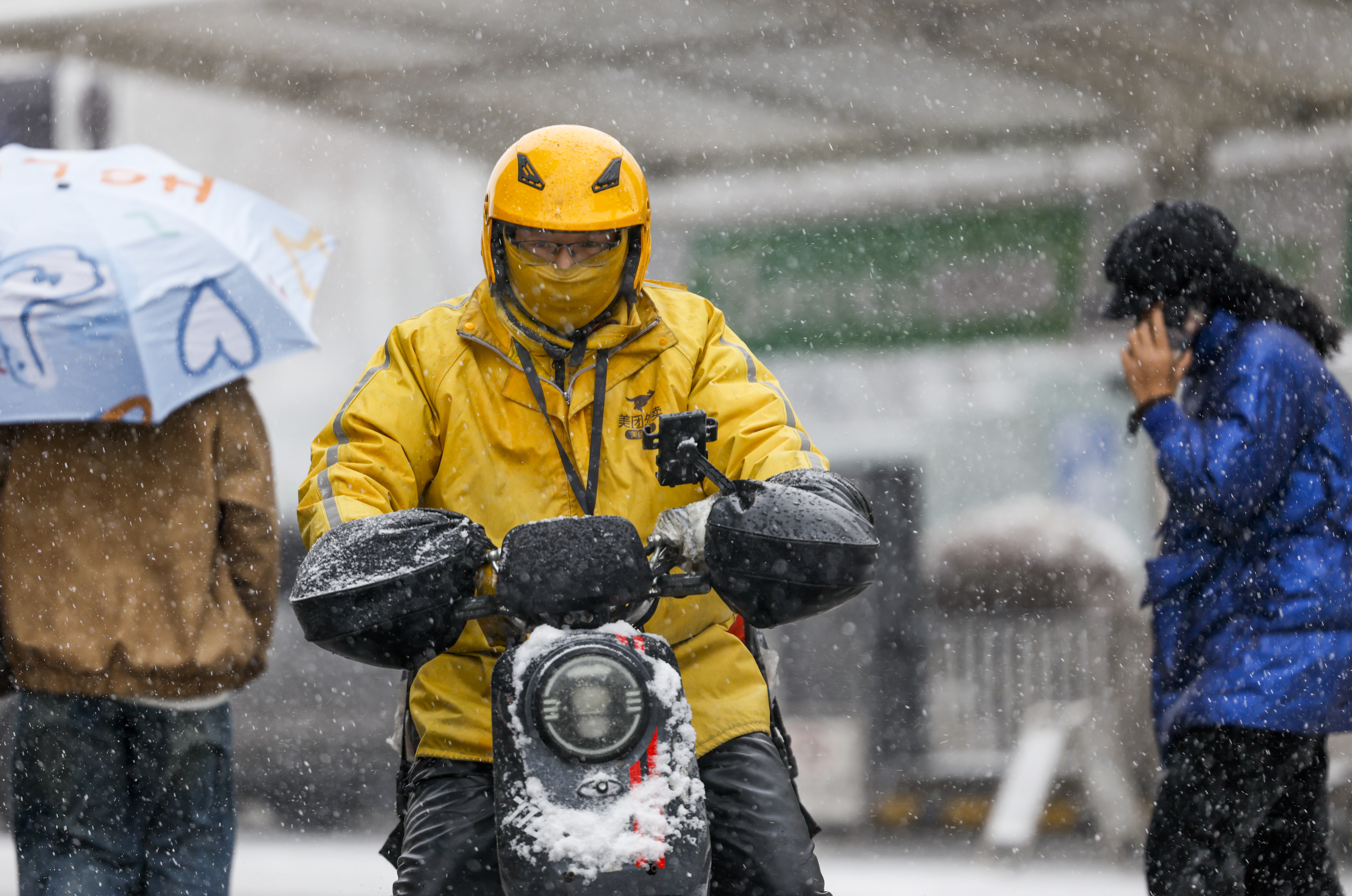 此时户外气温只有零摄氏度左右,寒风阵阵、地面冰冷。有骑手冷得待不住了,就搓搓手进商城暖和一会儿。
