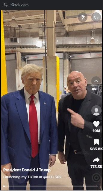 2024年6月,特朗普注册了TikTok账号,截至目前已有1470万粉丝,超1亿点赞。账号所发布的内容主要为竞选宣传。