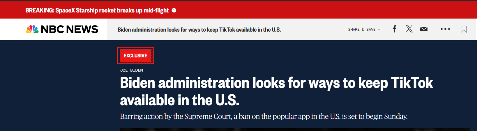 据媒体报道,该官员在一份声明中称,TikTok应在美国所有权下继续运营,但鉴于禁令生效的时机恰逢拜登政府离任前一天,因此将由下一届政府负责处理。