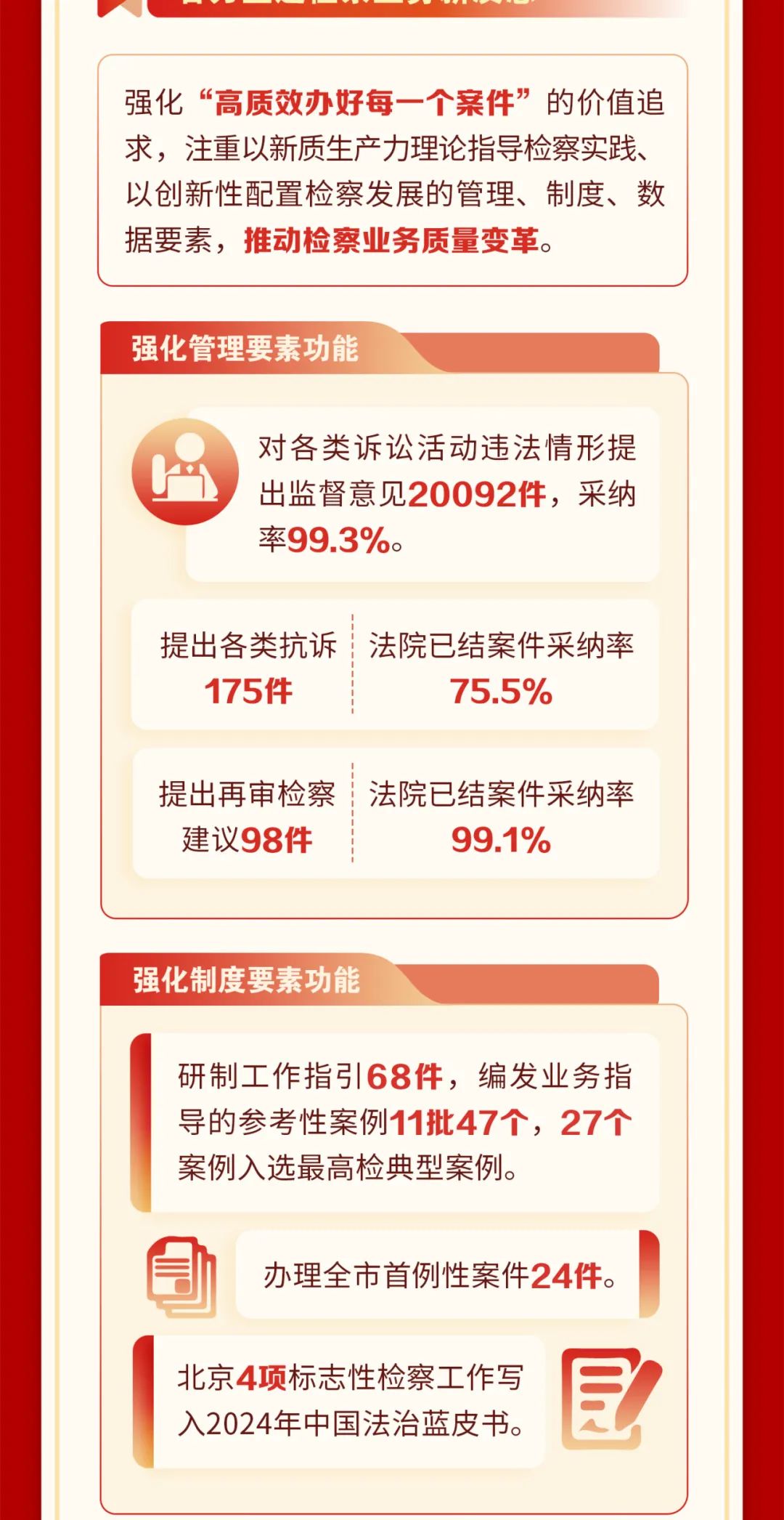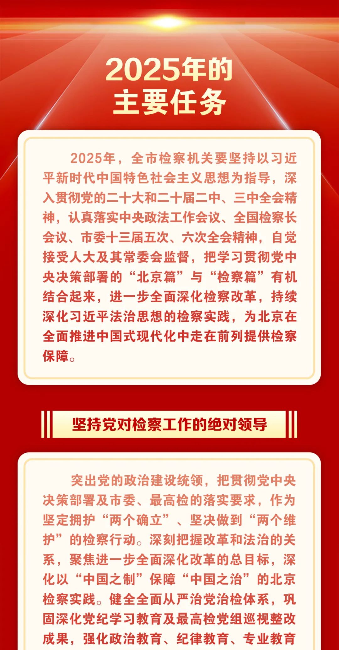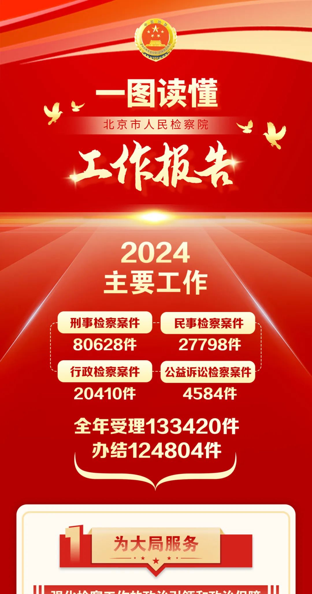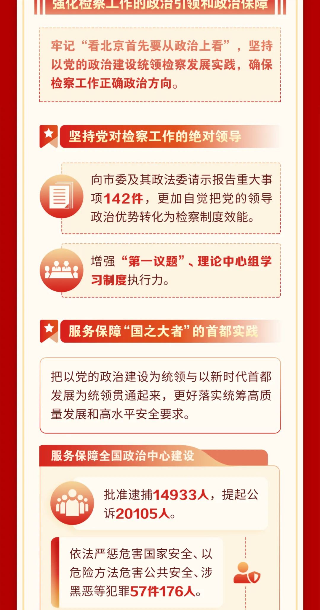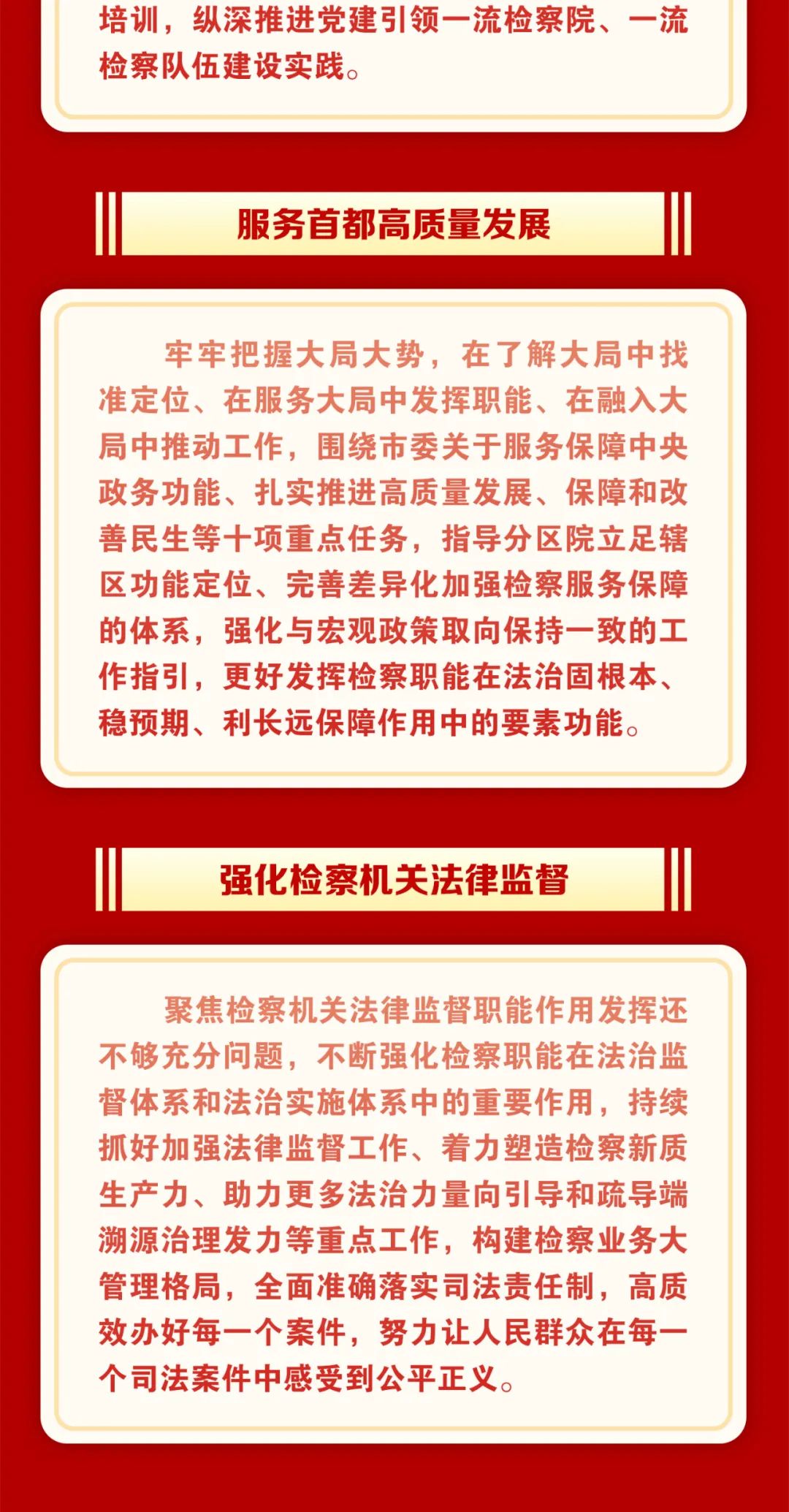 过去一年,全市检察机关在市委和最高检坚强领导下,在市人大及其常委会有力监督下,坚持以习近平新时代中国特色社会主义思想为指导,全面贯彻党的二十大和二十届二中、三中全会精神,深入学习贯彻习近平法治思想,坚定拥护“两个确立”、坚决做到“两个维护”,坚持党的领导、人民当家作主、依法治国有机统一,在为大局服务、为人民司法、为法治担当中守正创新,以推进检察工作现代化服务首都现代化建设。