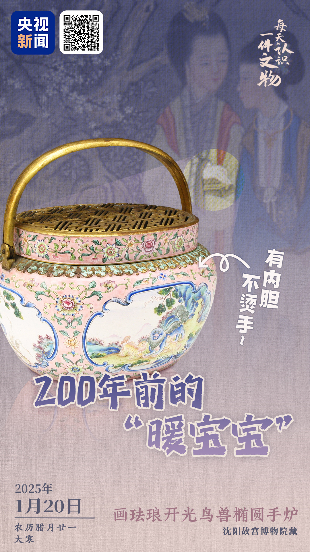 今日大寒,你穿羽绒服、贴暖宝宝了吗?古人也有自己的“取暖神器”,还是少女心爆棚的粉色款。三个看点带你认识,画珐琅开光鸟兽椭圆手炉。