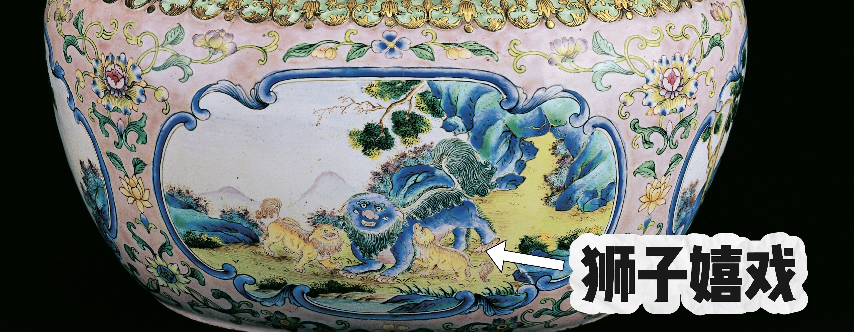 细看粉色多巴胺手炉表面,会发现有古人投送来的吉祥“图包”。海棠形的边框里,远山朦胧,树木葱郁,狮子正在带娃玩耍