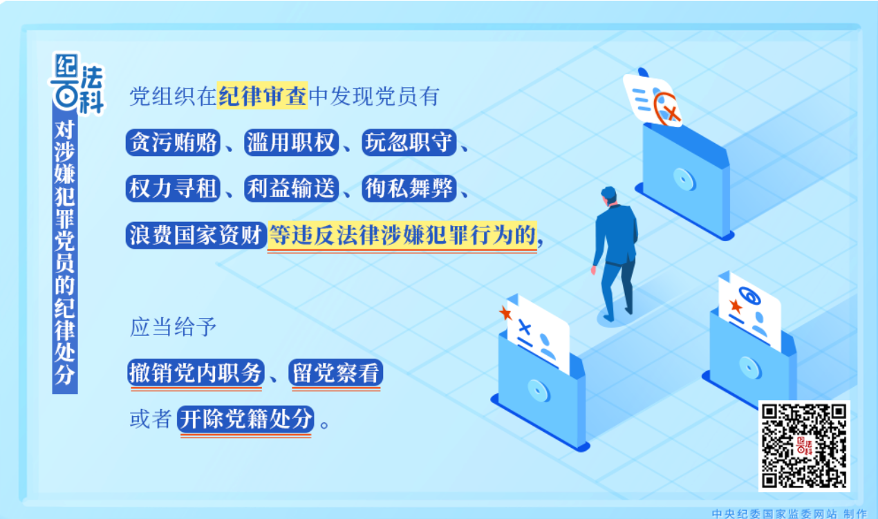 第二十九条规定,党组织在纪律审查中发现党员有贪污贿赂、滥用职权、玩忽职守、权力寻租、利益输送、徇私舞弊、浪费国家资财等违反法律涉嫌犯罪行为的,应当给予撤销党内职务、留党察看或者开除党籍处分。