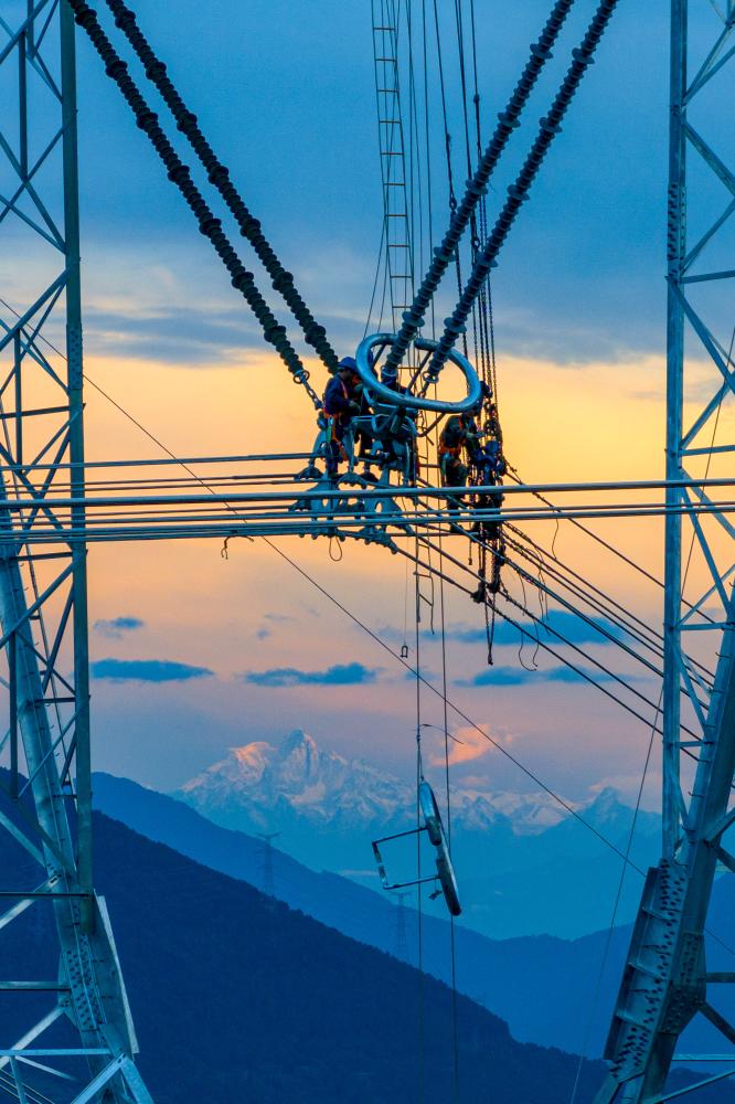 2024年10月14日,在四川省甘孜藏族自治州泸定县,施工人员在川渝1000千伏特高压交流工程进行附件安装作业。新华社发(田海 摄)