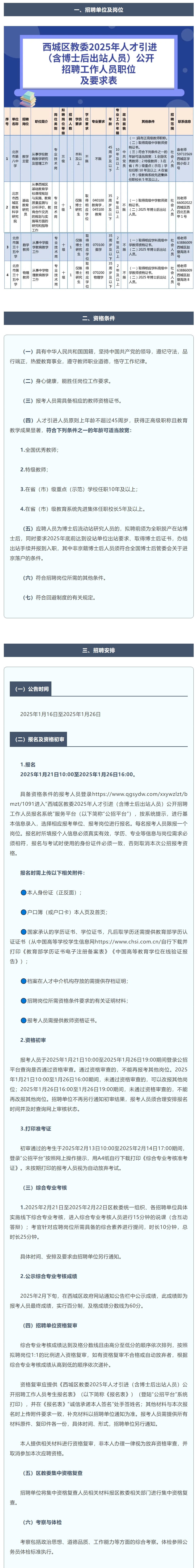 北京市西城区教育委员会面向社会公开招聘教育人才,报名时间为2025年1月21日10:00至2025年1月26日16:00。