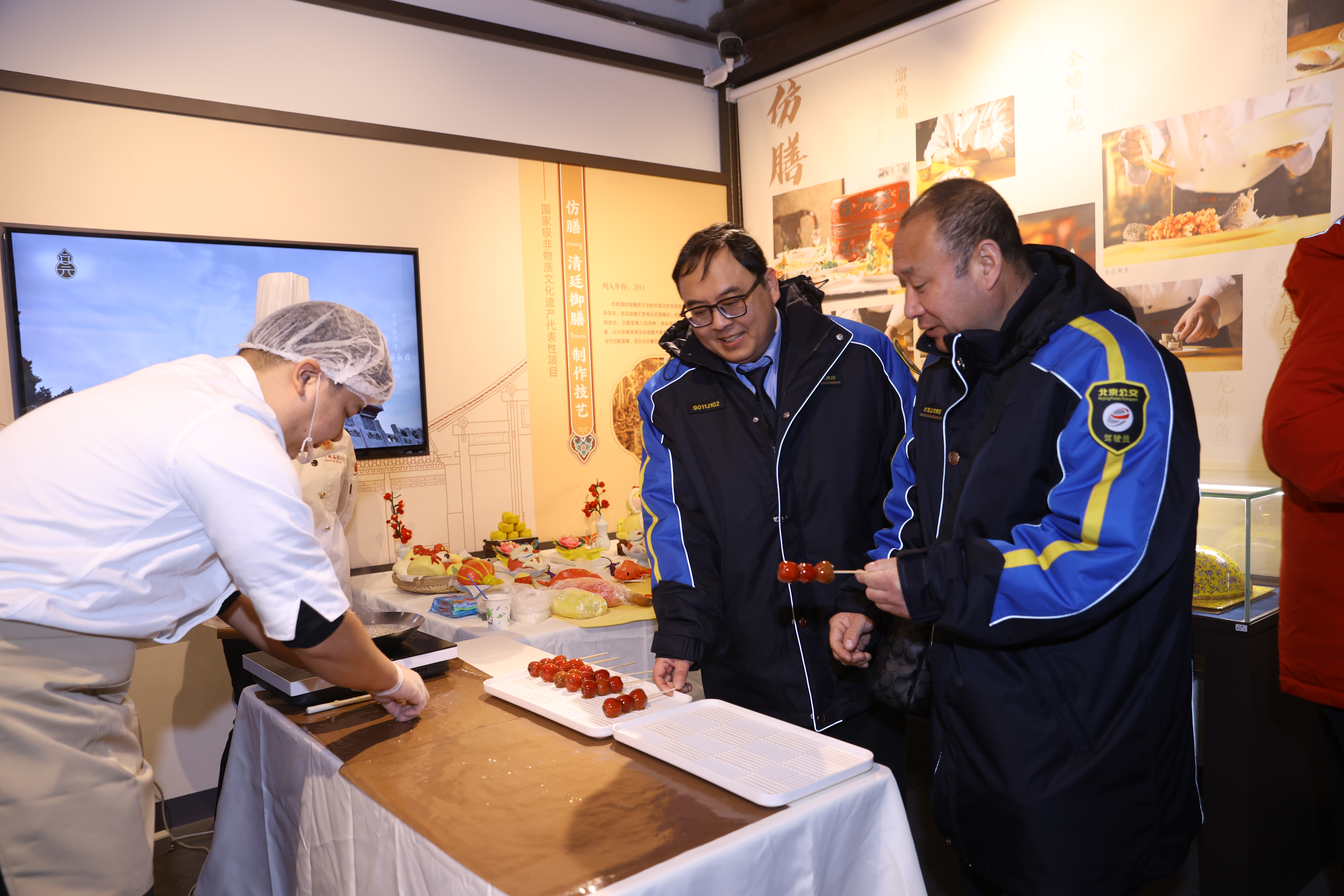 三进院的巨型宫灯与展厅内的宫灯交相呼应,春节的气氛越发浓重了起来,彩塑京剧脸谱、中国结、糖葫芦、花饽饽,这些童年记忆里跟春节相关的记忆,在此刻仿佛时空交叠,通过一位位传承人的讲解与展示,生动呈现了他们坚守匠心、勇于创新的精神风貌。