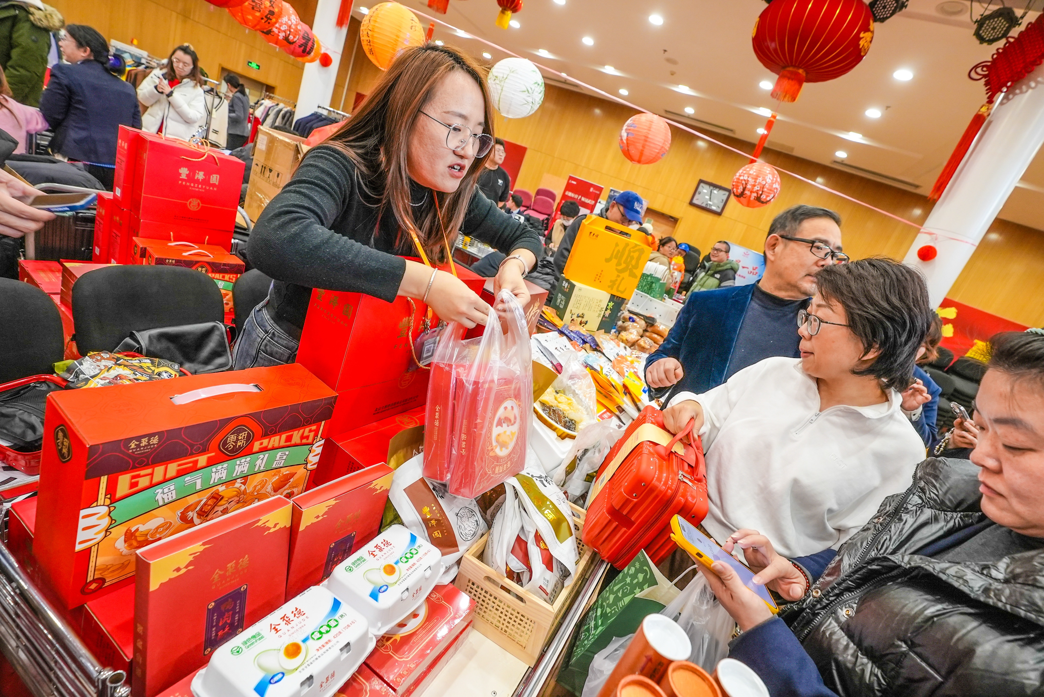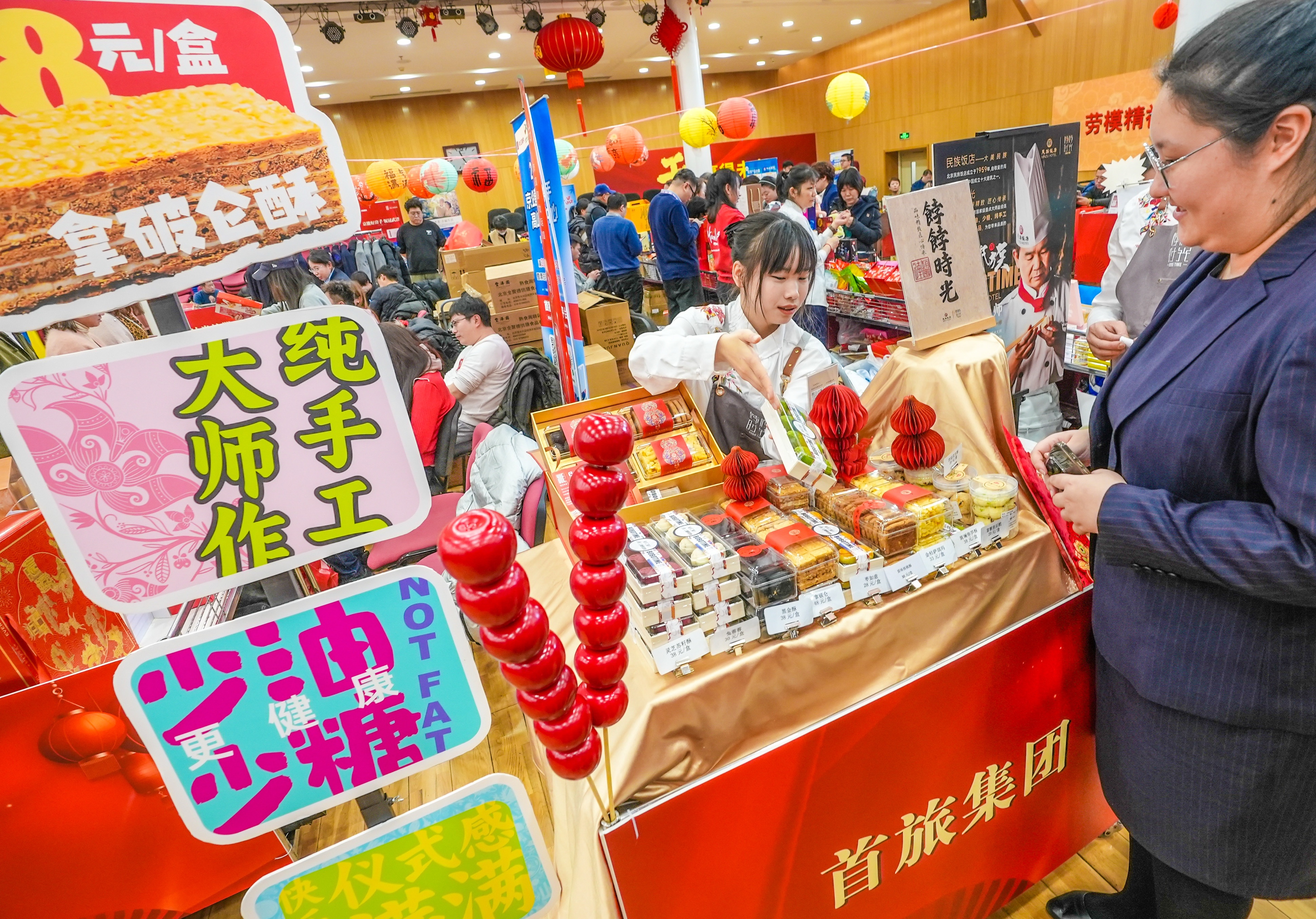 琳琅满目的商品摆满了各个展位,首旅集团带来了全聚德的年货礼盒、东来顺的现做茶饮、莫斯科餐厅的面包、民族饭店的中式茶点、首旅旅行的精品线路、京彩公司的特色文创、王府井集团的生活用品、首旅酒店集团的住宿套餐等。“买了东来顺的熟食、民族饭店的中式点心、丰泽园的佛跳墙礼盒、首旅旅行的新春特色冰箱贴,一站式购齐了年货!”市民周先生满载而归。
