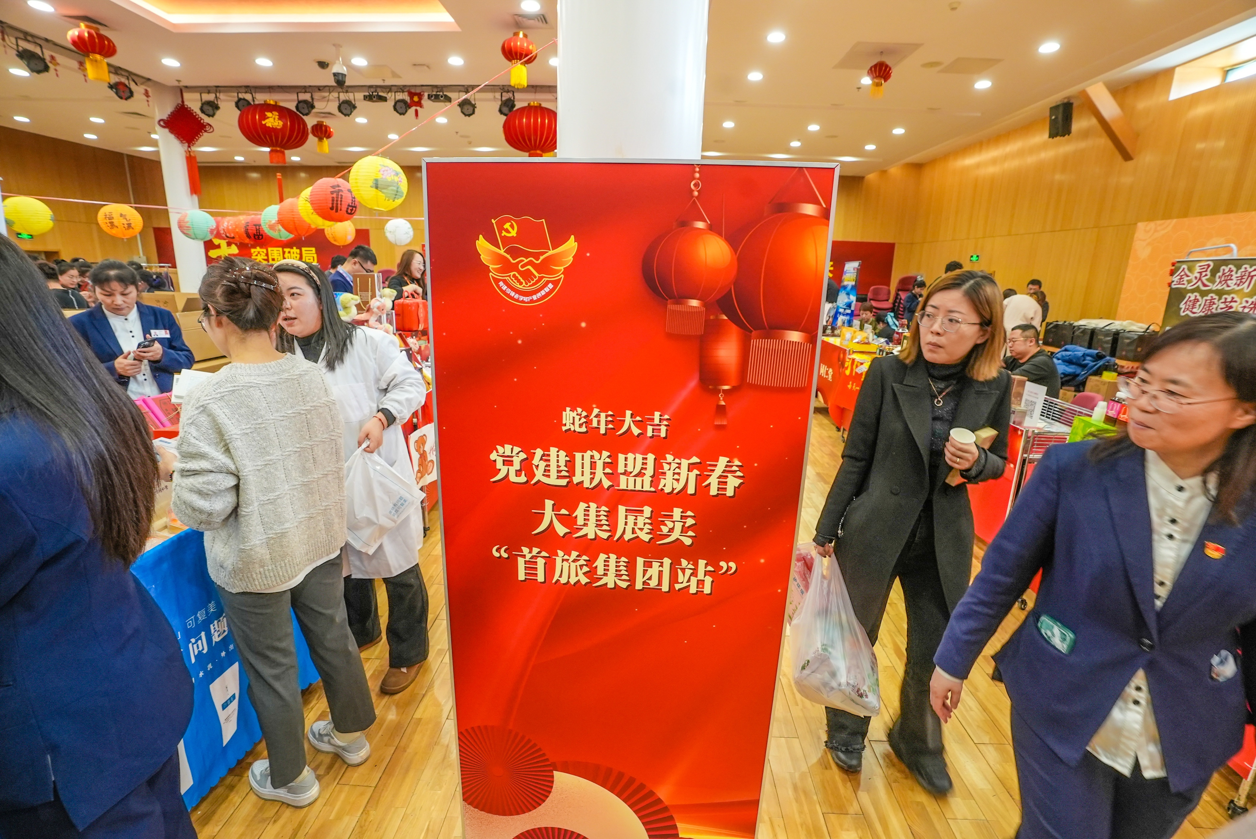 1月21日上午,王府井百货大楼南馆五层人声鼎沸,热闹非凡。由“党建引领老字号产业创新联盟”主办的新春大集“首旅集团站”启动,吸引众多企业职工的热情参与。