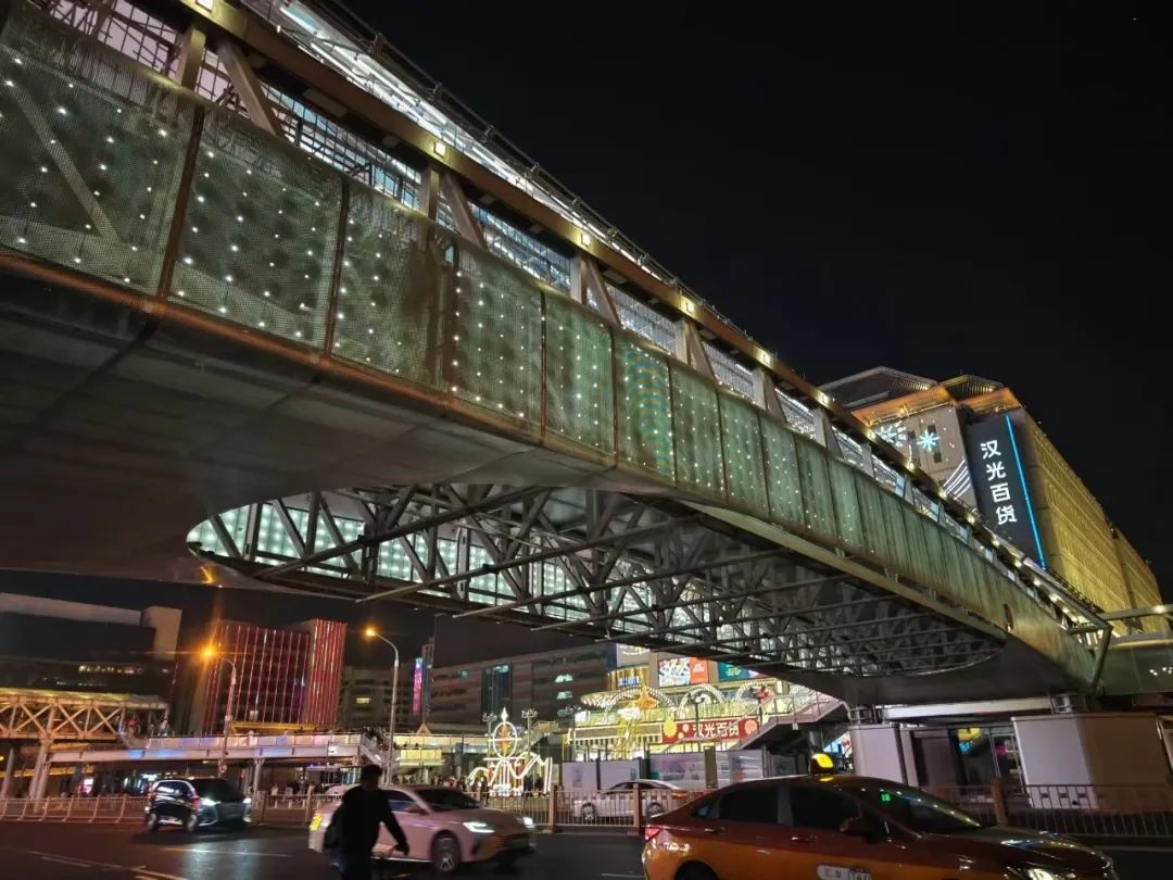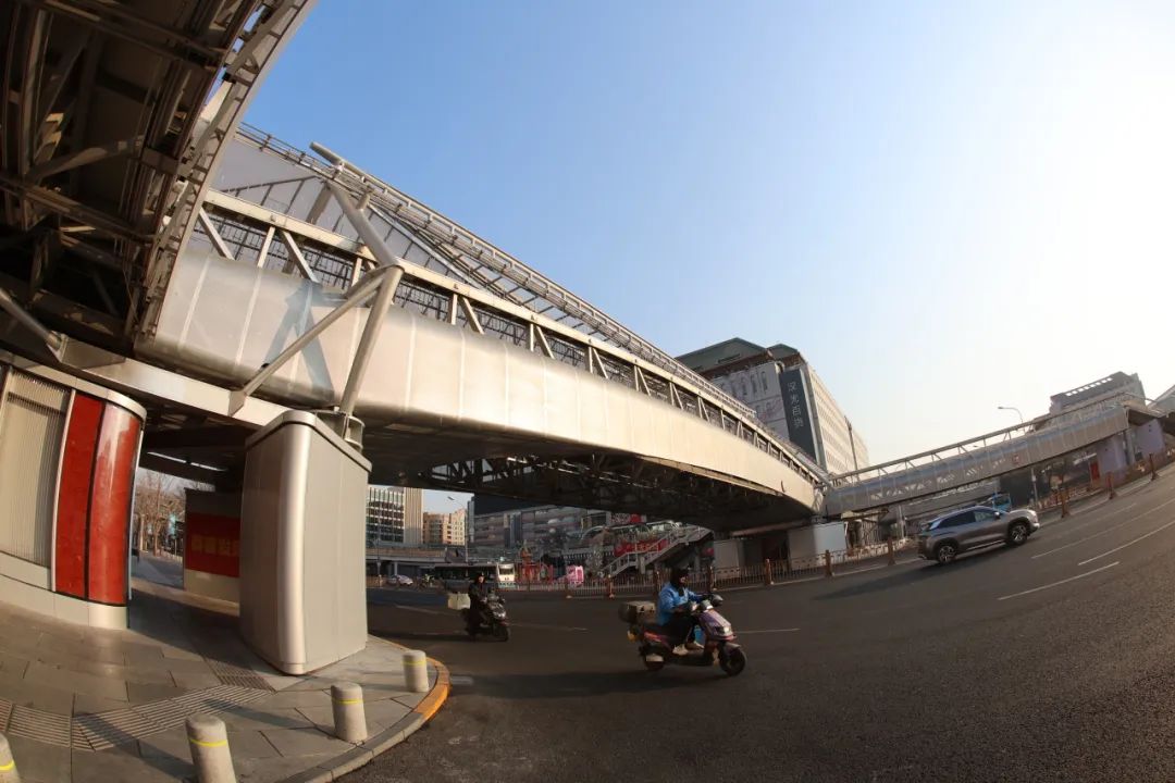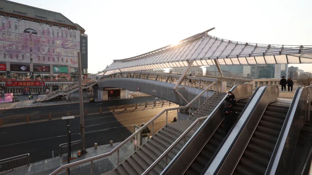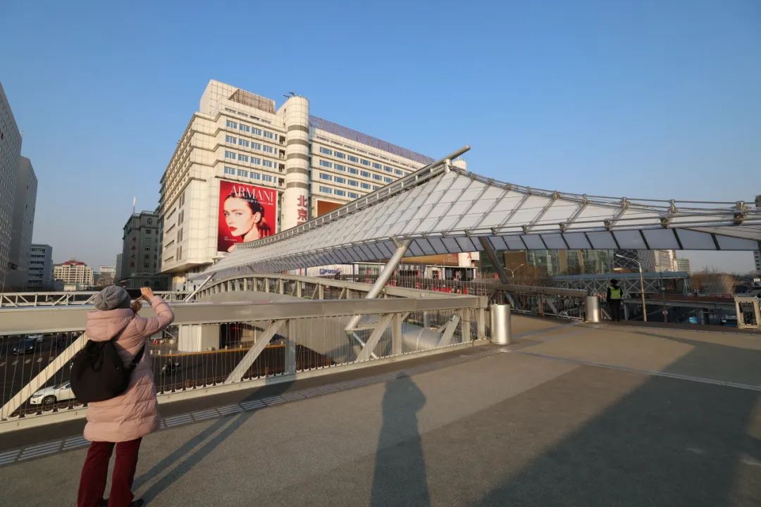 走上廊桥,记者看到,连廊上方建设有半透明的A字结构,可以遮阳避雨。桥面铺设塑胶,从汉光百货“直达”君太百货,可以一键开启舒适又美观的通行体验。“我平时也比较喜欢逛街,现在商场之间通行更便捷了,趁着春节期间各个商场推出了年货节活动,和家人朋友多来逛一逛。”前来购置年货的王女士说道。西单连廊一号桥的通行,不仅解锁了西单商圈畅行新路线,也成为了大家新的打卡地。而西单商圈作为北京著名的商业地标,每一次变化都牵动着市民的心。家住附近的李阿姨说:“我在这儿住好多年了,这次改造后的廊桥看起来更轻盈、更有科技感,尤其夜晚亮灯后,整座桥都流光溢彩,特别有‘商圈气质’。”