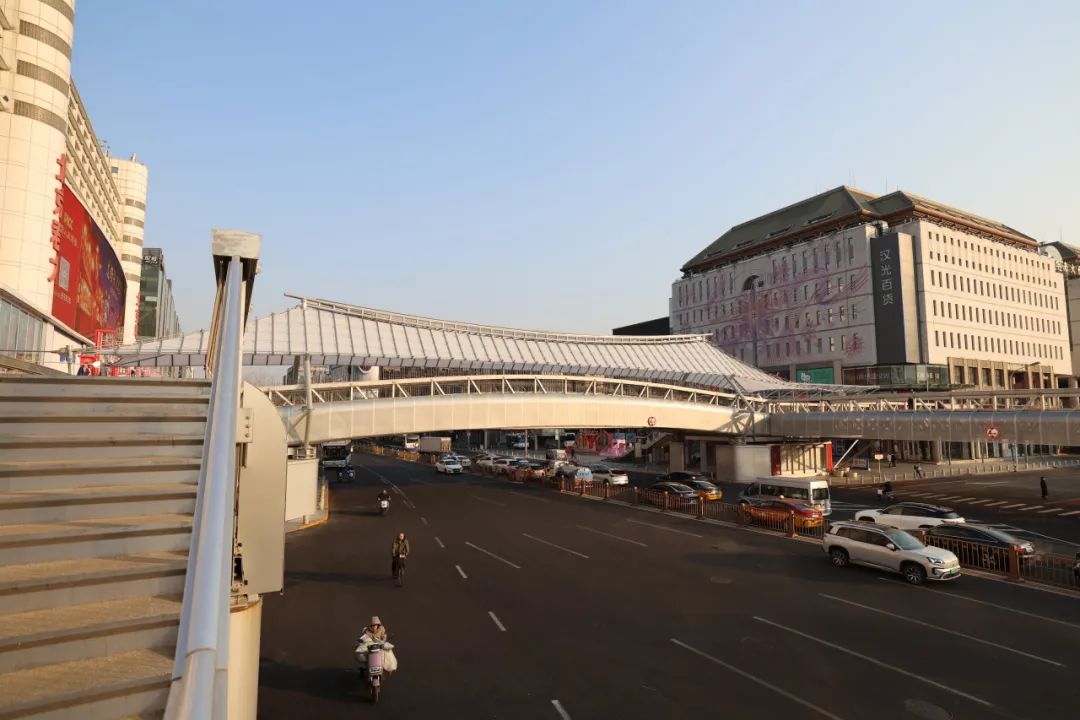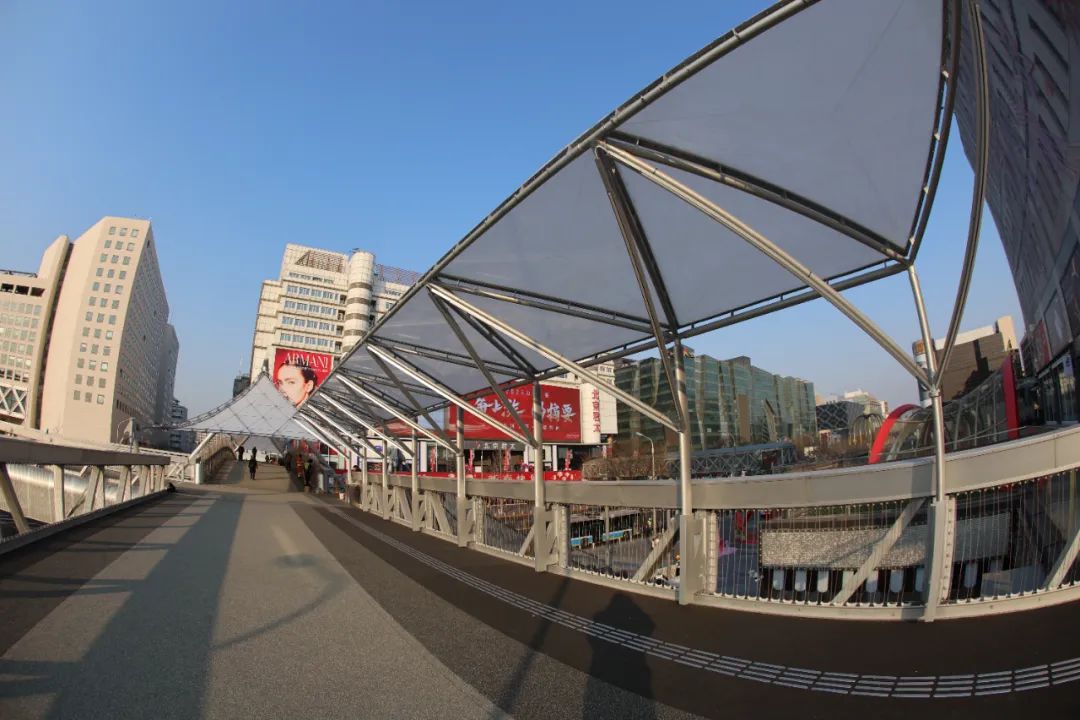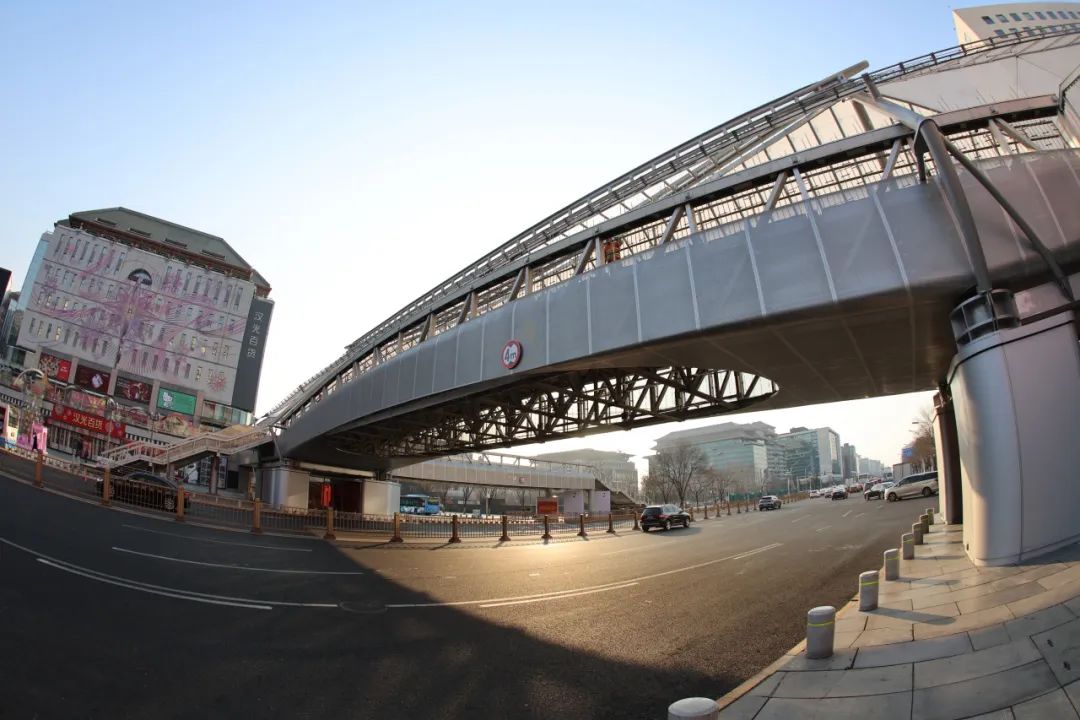 西单连廊一号桥是位于西单路口北侧的一座过街天桥,主桥东西向跨越西单北大街,连接汉光百货和君太百货。作为“西单连廊系统空间提升工程”的一部分,西单连廊一号桥更新改造于近日完成,并于今日正式通行。