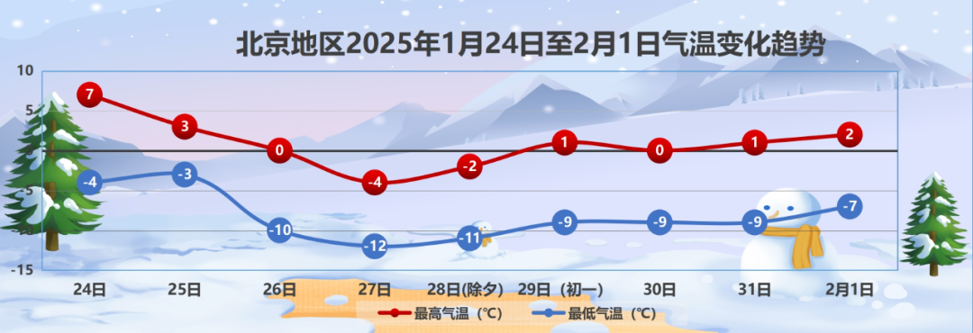 气温一路下跌,预计26日至28日最高气温将跌至冰点及以下,夜间最低气温将跌至-10℃以下,附加北风加持,体感非常寒冷。随后气温才开启缓慢爬升之路,这个春节有点冷。预计2025年1月24日至2月1日期间,南郊观象台最高气温-4℃至7℃,最低气温-12℃至-3℃。