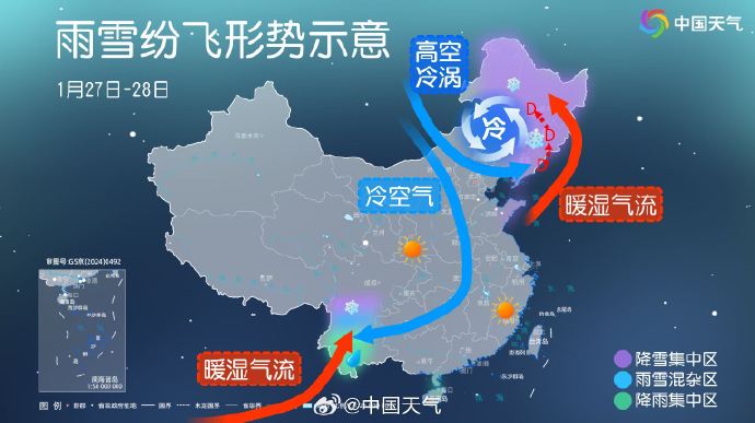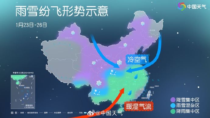 图1:今天(23日)开始至27日,北方冷空气逐步东移南下,同时南边有偏东和偏南两支气流输送水汽,冷暖交汇之下,大范围雨雪过程展开。