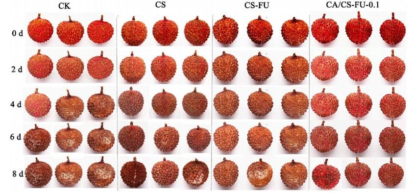 岭南师范大学刘锴栋团队利用壳聚糖(CS)和氧化褐藻糖胶(CS-FU)以及包封肉桂醛(CA) 制备的一种可食用复合薄膜可以显著提高荔枝的保鲜时间(>8天)(文献图片)