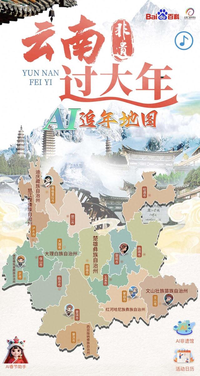 “云南非遗过大年”AI追年地图由云南省文化和旅游厅、百度百科推出,旨在通过科技赋能非遗,为公众提供便捷、智能的云南非遗活动体验指南。