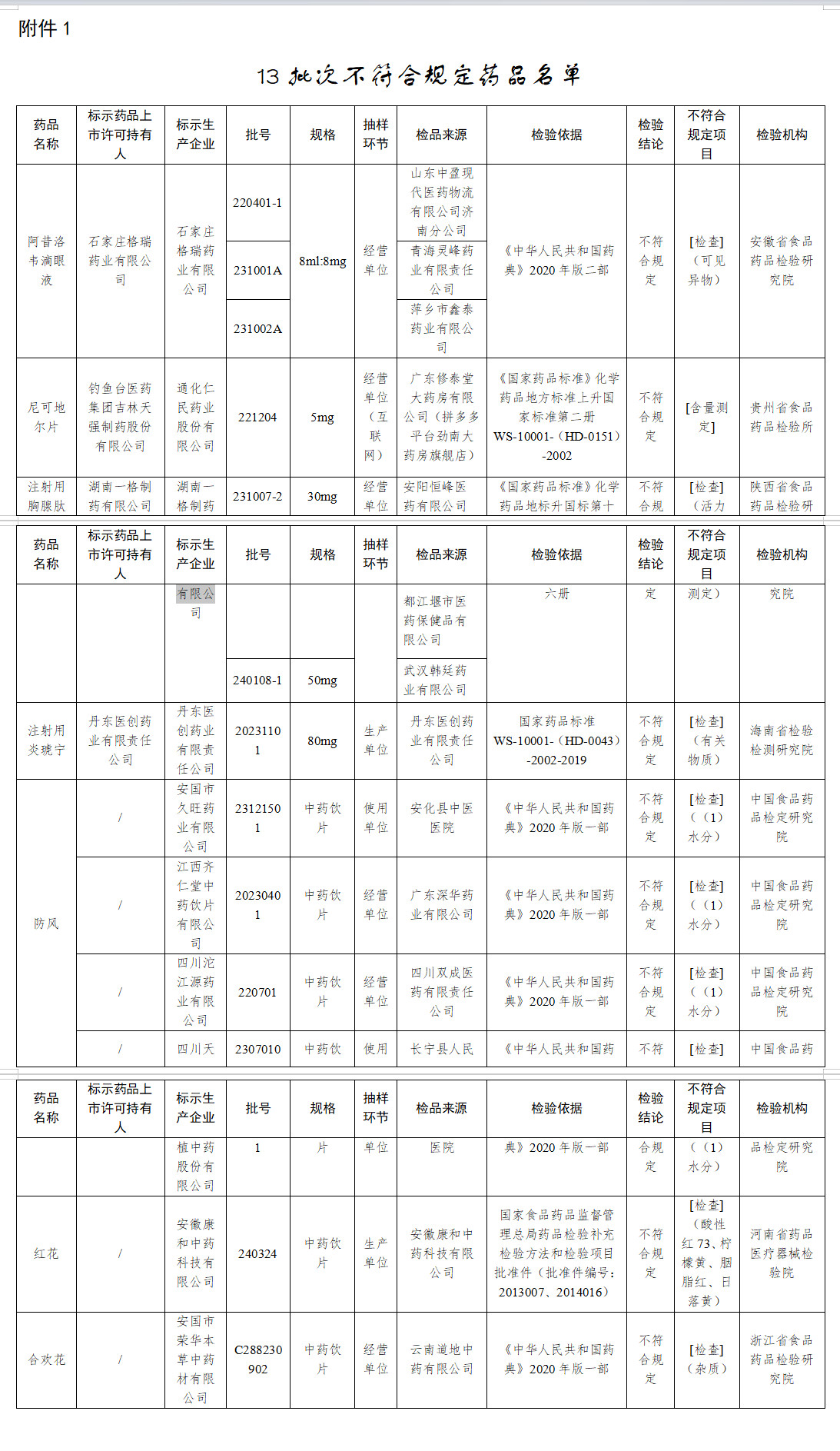 经安徽省食品药品检验研究院等7家药品检验机构检验,共10家企业生产的13批次药品不符合规定。现将相关情况通告如下: