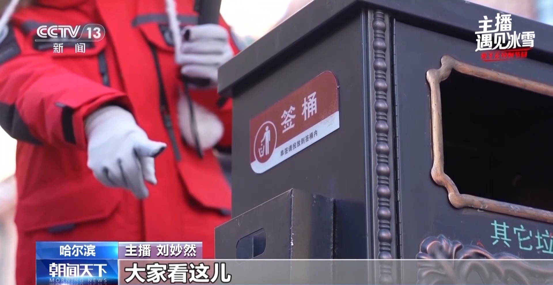 主播 刘妙然:在这里,有专门装签的桶,这样可以节省空间。我们一路从中央大街走过来,感觉非常干净。据我所知,中央大街的人流量特别大,最高的瞬时人流量可以达到3万人次。所以这里的环卫工人基本上是每8分钟就会清理一次垃圾桶,让大家的体验感变得更好。