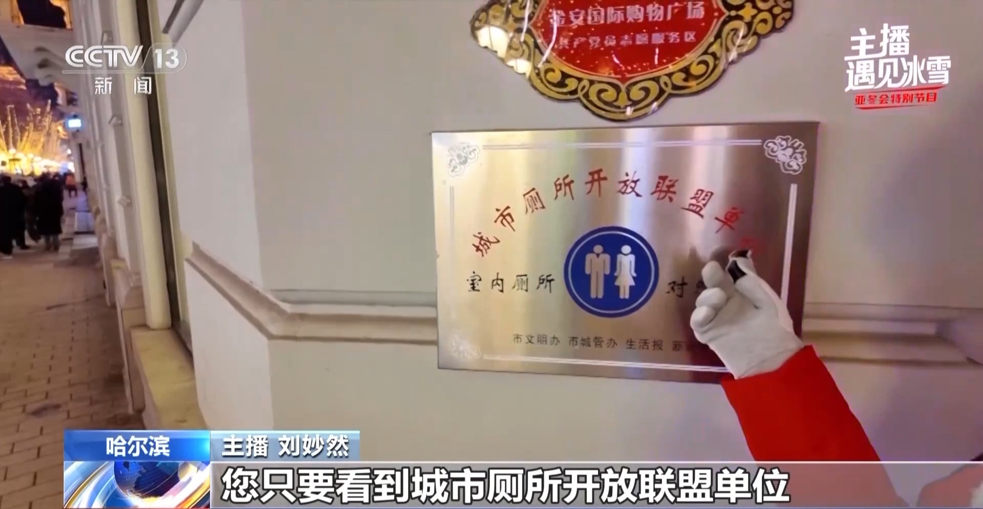 主播 刘妙然:人都有三急,但是在中央大街上,您只要看到城市厕所开放联盟单位,就都可以进去上厕所。