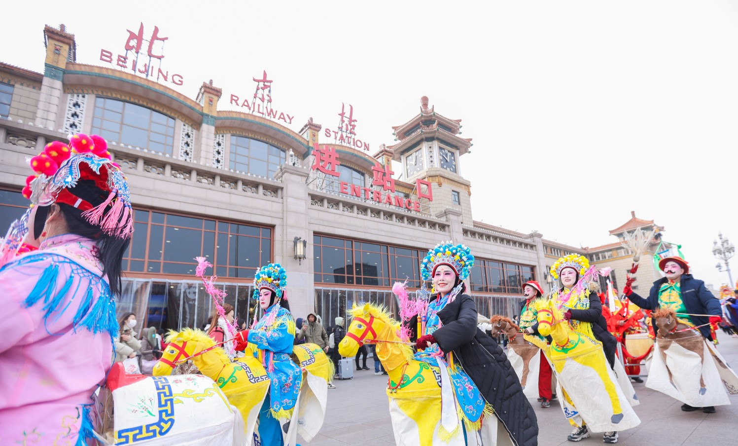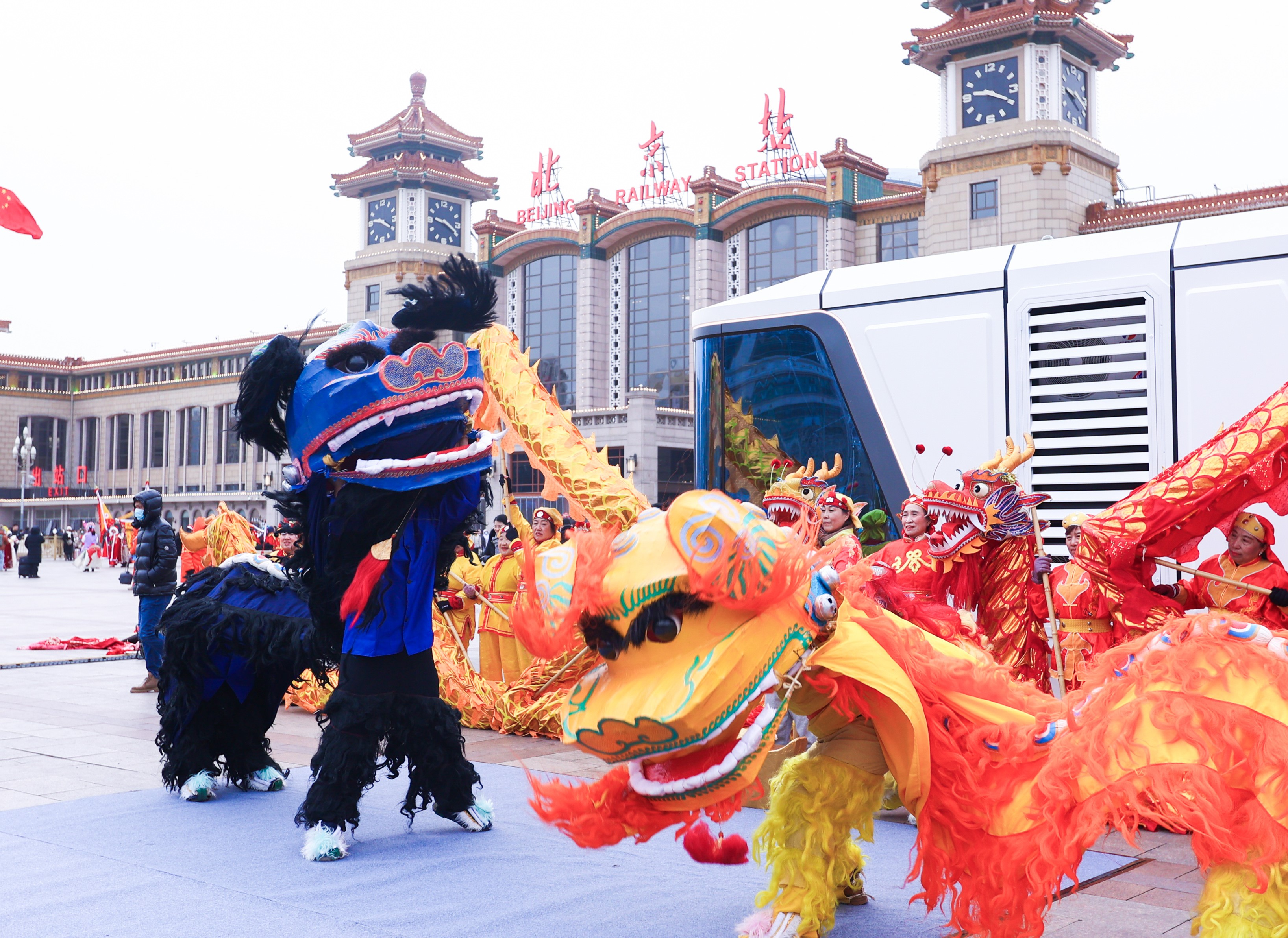 在北京站及站前广场上,“非遗过大年”系列活动轮番上演,各行各业的工作人员和“旅客身边人”志愿者们为旅客送上福字和春联,让返乡的旅客在归途中感受年味、感受传统文化的魅力,为旅客们营造“到站即到家”的欢乐祥和氛围。