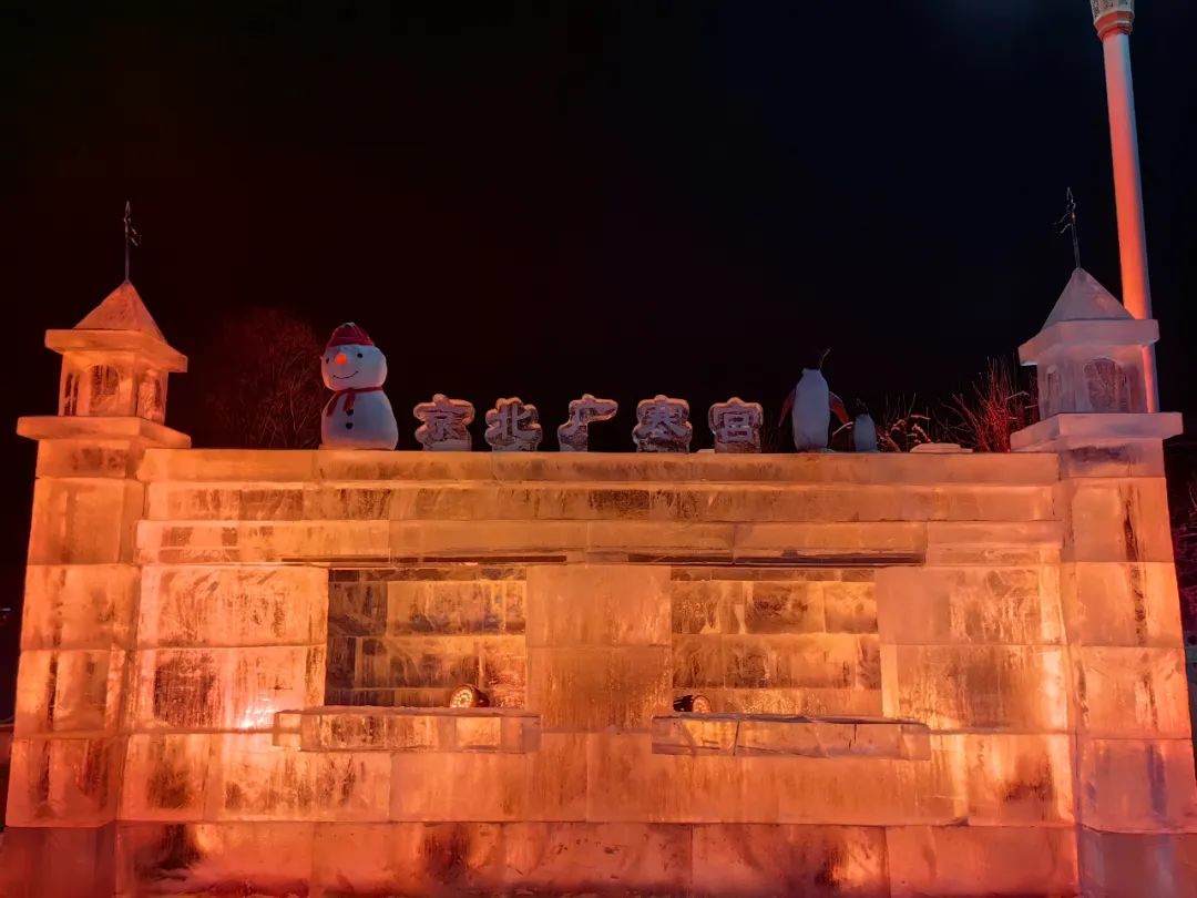 广场旁,“冰屋”稳稳矗立在雪面上,墙壁晶莹剔透,线条刚硬流畅,装饰惟妙惟肖,十分精美。入夜后,在灯光装饰下,它像被施了魔法,通体散发出五彩光芒,美轮美奂。
