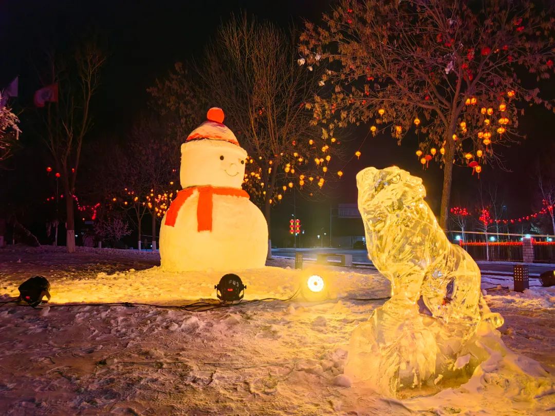 树枝上、广场里,花灯、雪人,红装素裹,江山多娇。北极乡的夜色里,灯笼照着雪人,为冬日天地增添了如画风光。它们与来往游客一起拍照打卡,合影留念,为沟门乡冬季文旅增添了一抹亮色。