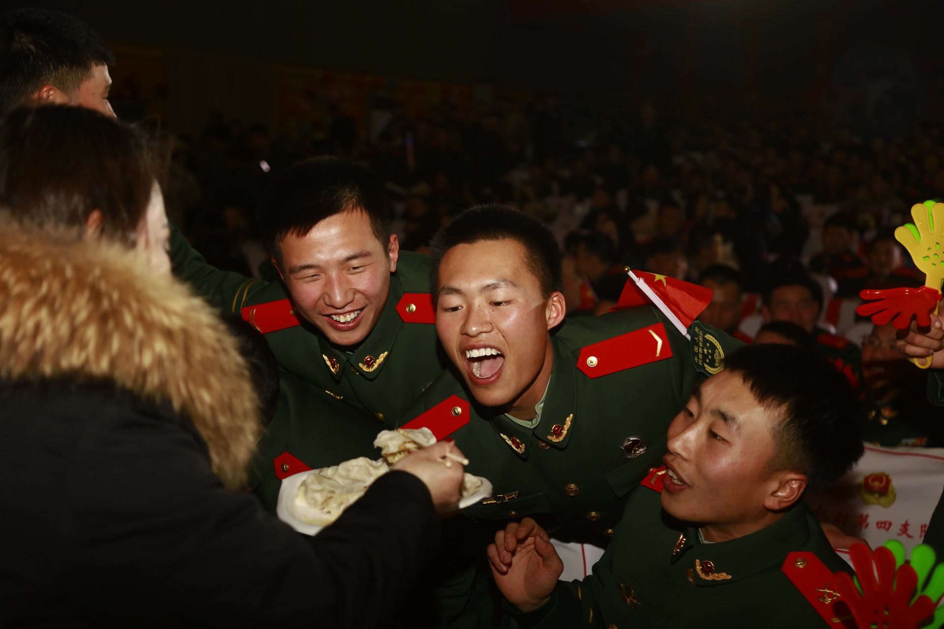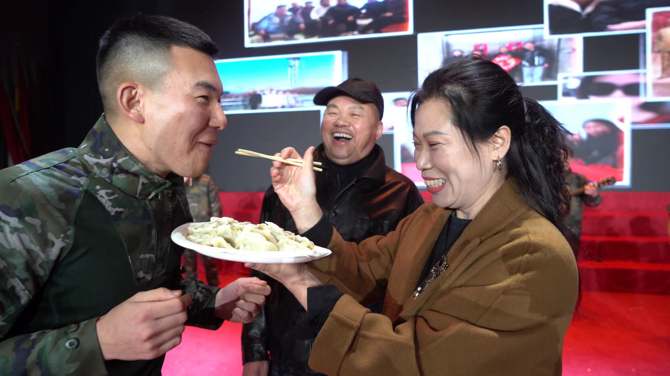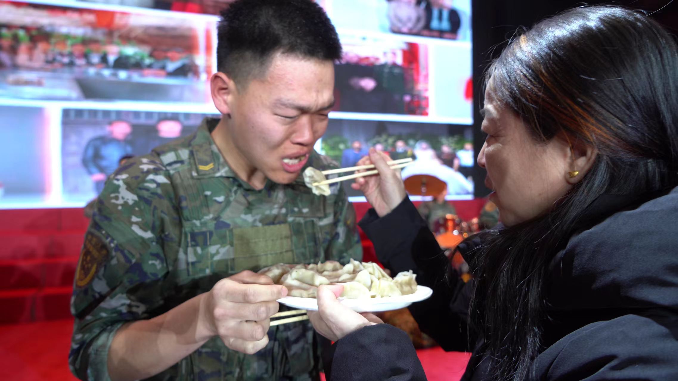 十几位爸爸妈妈们被邀上台,把自己包好煮熟的饺子现场喂到儿子嘴里。战士们吃下饺子的那一刻,有人泪水夺眶而出,哽咽得说不出话来。这泪水里,有对妈妈的思念,有多年没能陪伴家人的愧疚,更有此刻团聚的感动。而有的战士则幸福得合不拢嘴,眼睛笑成了一条缝,嘴里不停地说着:“好吃,真好吃。”