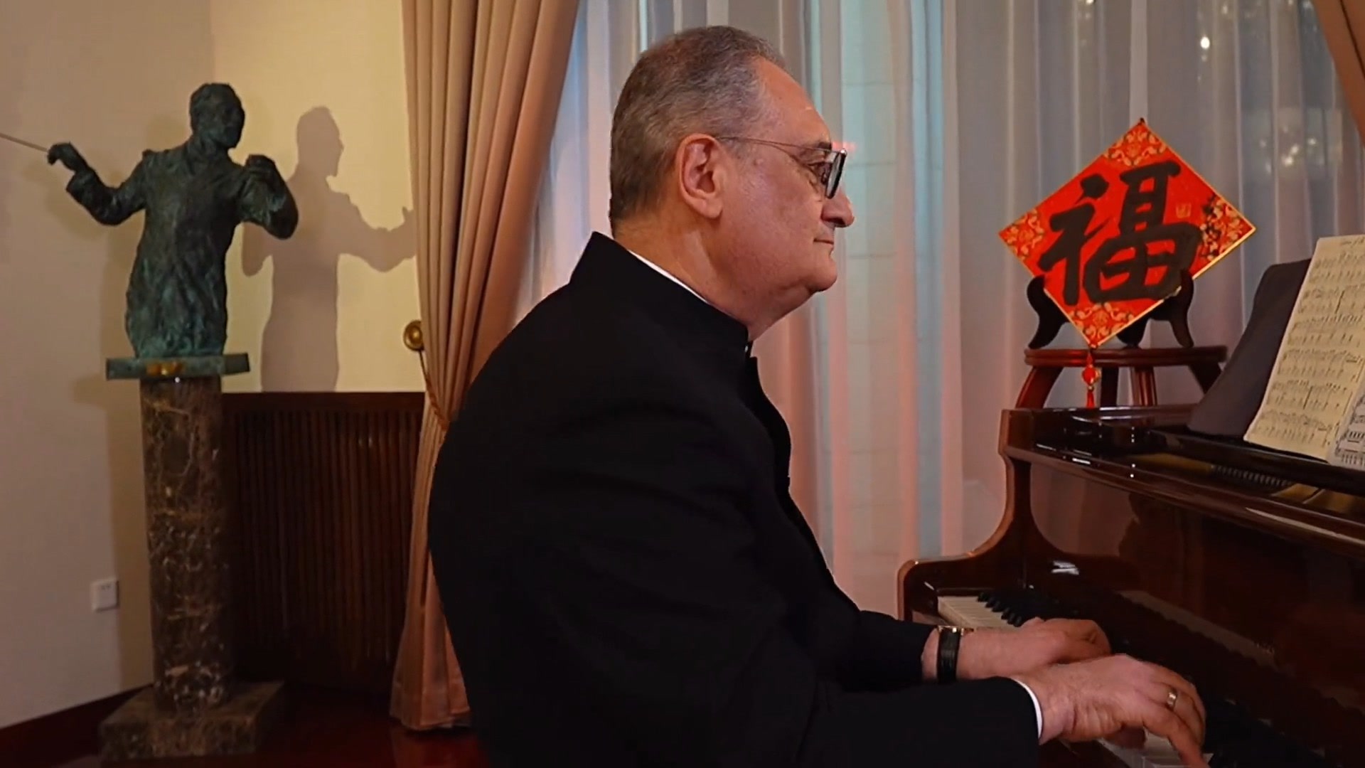 在俄罗斯驻华使馆发布的视频中,只见莫尔古洛夫身穿黑色的中式立领服装,胸前佩戴着一枚象征蛇年的金蛇徽章,在钢琴前亲自弹奏了中国传统名曲《金蛇狂舞》。