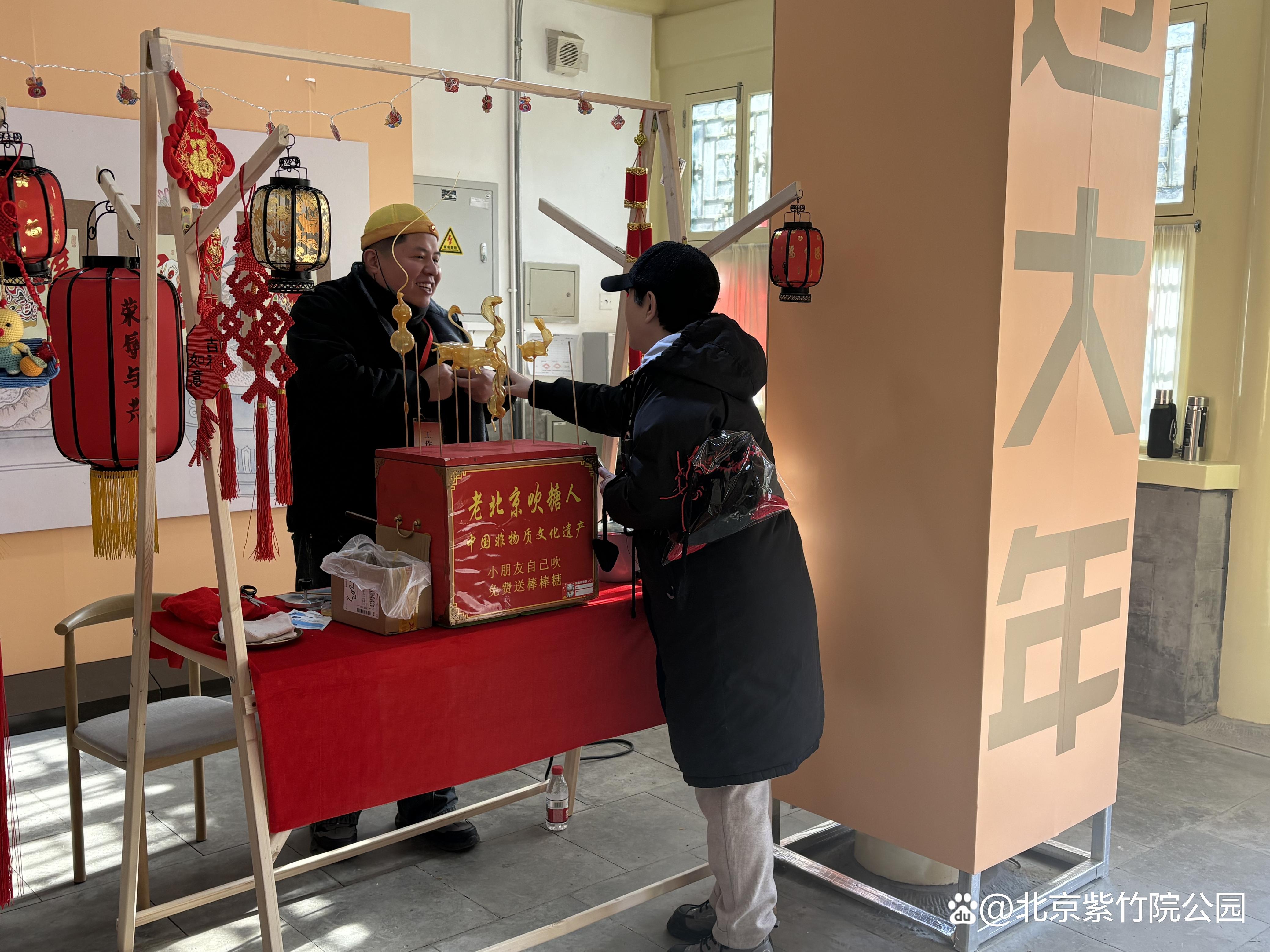 行宫院内和长廊上挂满了五颜六色的灯笼,彰显了蛇年春节的欢乐气息。在静逸斋的非遗互动小市集中,非遗传承人们现场展示剪纸、糖人、灯笼等手工技艺,观众可以亲自参与和体验,体验非遗文化的独特魅力。